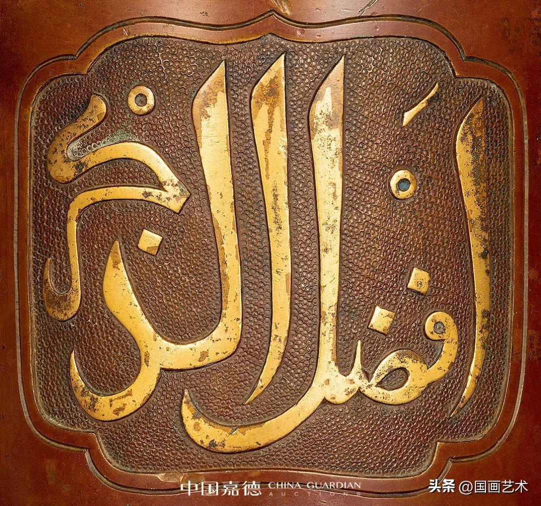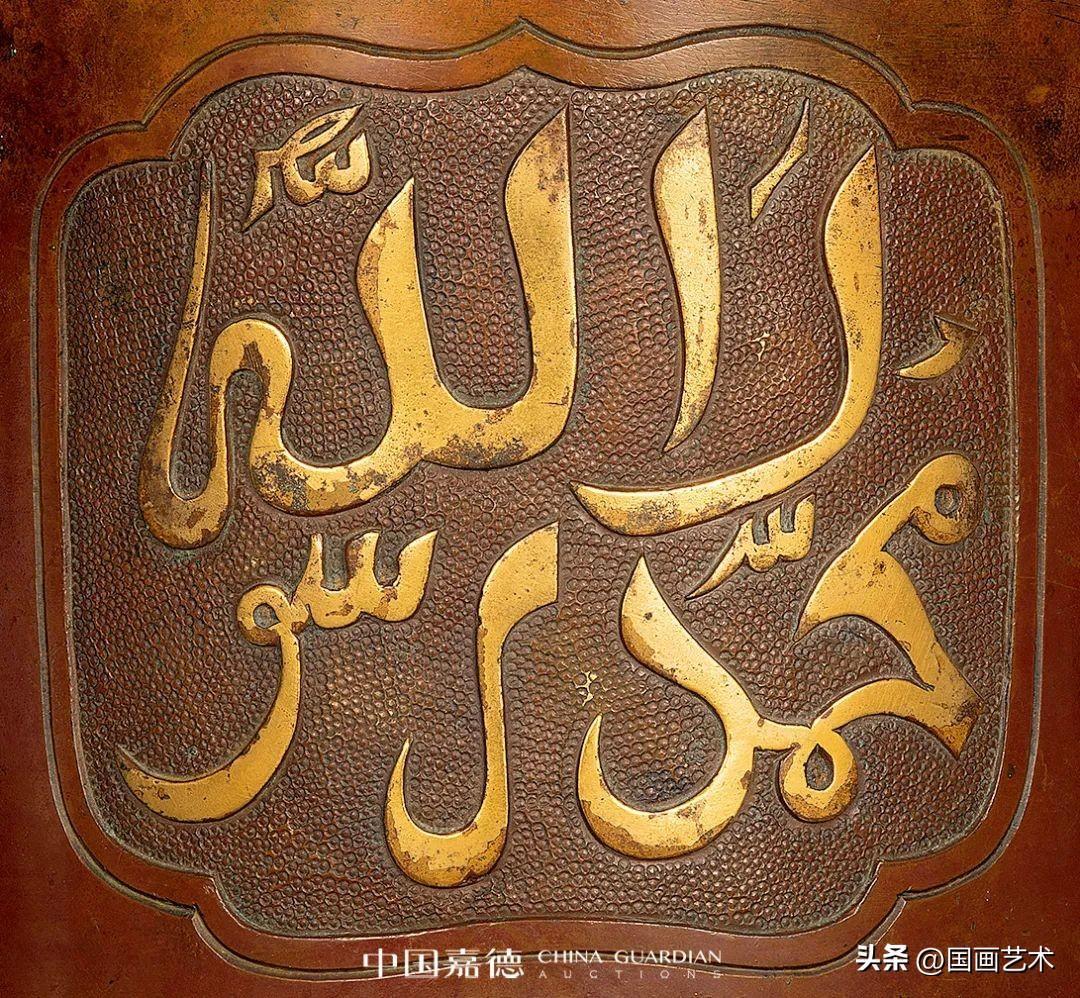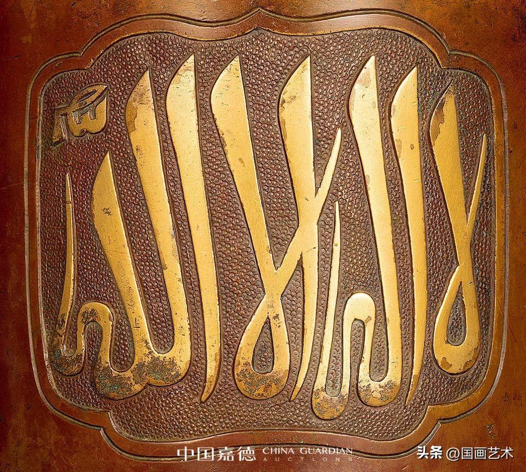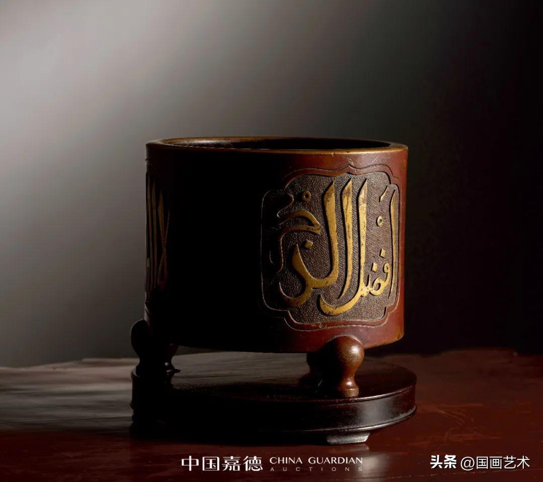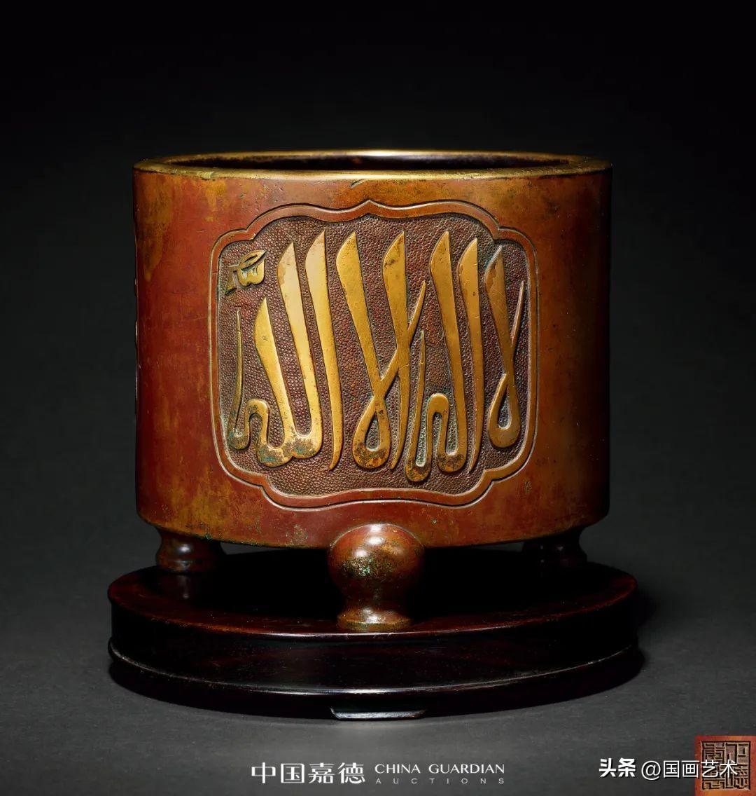 此爐形雋雅周正,圓口微斂,直筒腹,腹下緣承以三簡化獸足,圓潤外鼓凸,轉折出足,呈外撐狀,粗壯有力,巍然似鼎,顯渾厚沉雄之精氣。腹壁設三如意形開光,內以魚籽錦紋爲地,飾阿拉伯文,系伊斯蘭教聖訓哲言,善禱善祝,以爲祈福,文字流暢優美,書寫精絕,有刀筆合一之功。爐底正中開方框署“正德年制”四字篆書款,結體中正,鑄後精修,筆劃剛勁有力,鏨刻深峻,端正莊敬。整器棗紅與慄殼皮色交錯,配以口沿、阿拉伯文的局部鎏金裝飾,案前賞之更覺輝燦華美。