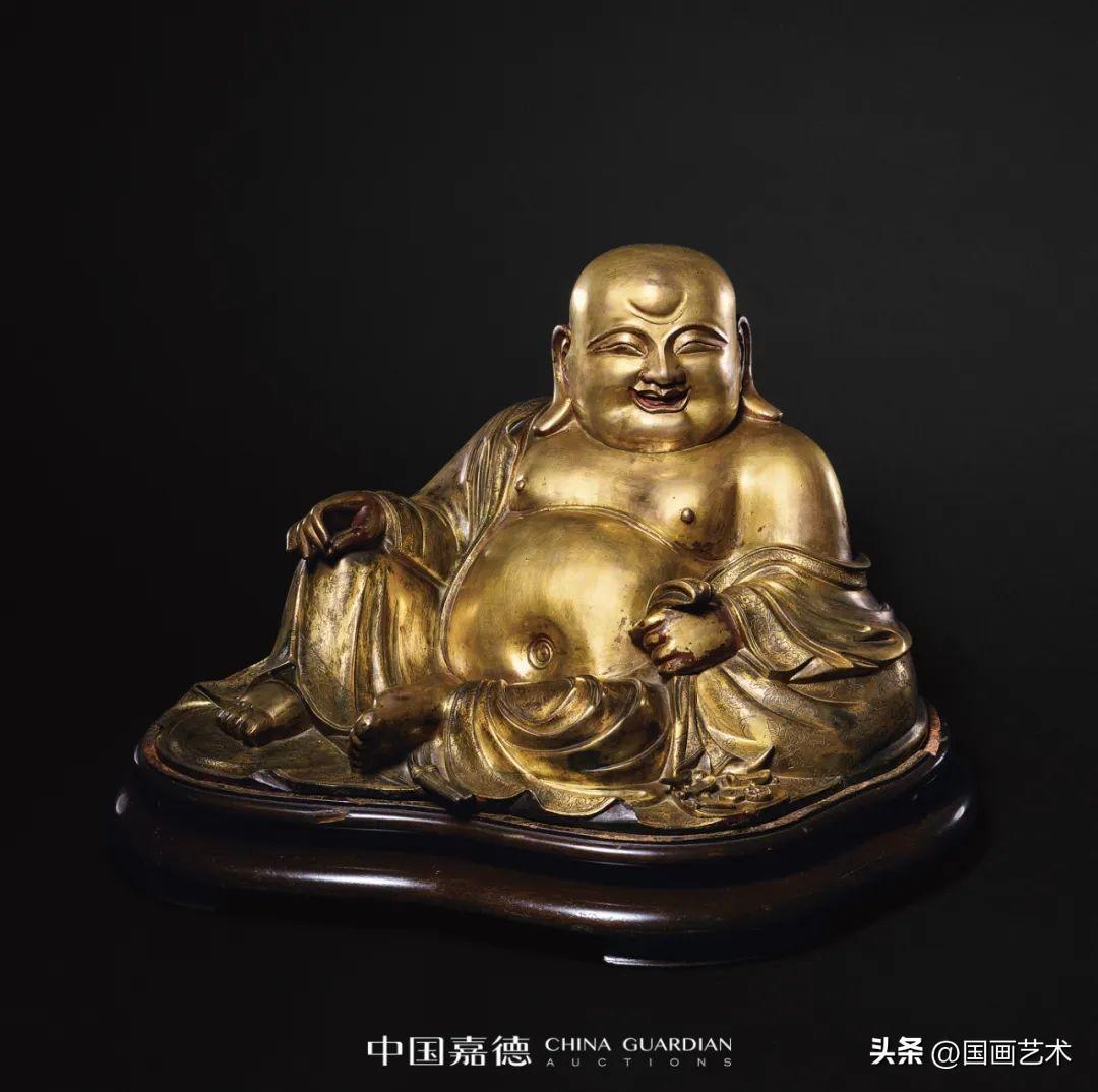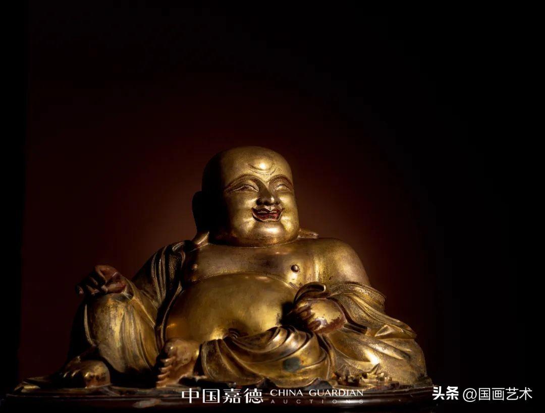 此尊彌勒坐像身軀穩健端莊,圓腦碩首,大耳垂肩,細眉杏目,嘴角上揚,張口大笑,面容和悅,呈半跌迦坐姿,右手搭於右膝之上,左手倚靠並抓握乾坤袋,元寶、文錢散落一側。身披寬袍,袒胸露肩,衣褶散逸,自然流暢,疏密有序,毫無滯感,衣飾緣邊及乾坤袋均鏨刻精細的折枝花卉紋。通體鎏金,金水凝厚飽滿,供養傳承年代既久,局部紅斑凸顯。整器鑄雕工藝精湛傳神,姿容刻畫精絕,傳神寫照,將佛祖憨態可掬、悠然自得的形象表現得遊刃有餘,逸趣橫生。觀之身心愉悅,誠如古人所言:“大肚能容,容天下難容之事;開懷一笑,笑世間可笑之人。”