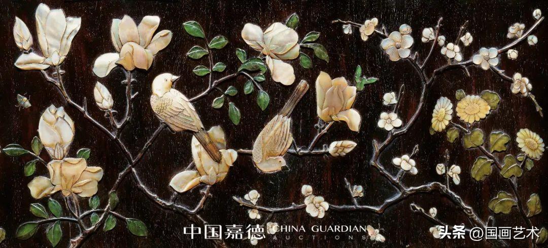 外壁打槽鑲嵌玉蘭花兩株左右相欹,曲幹遒勁有力,有飽經滄桑之感,玉蘭花於枝頭或欲放,或盛開,顆顆飽滿,如沐春風。韌枝之上,雀鳥一回首而棲,一探首抬尾,體態肥碩,羽翼豐滿,姿態栩栩如生。旁有蒼勁梅花一株,虯枝奮力伸展,枝杈橫折有力,枝頭梅花競相綻放,又見野菊搖曳生姿。畫面取法折枝花卉立意,以厚實螺鈿嵌花瓣,碧玉嵌花葉,色彩鮮明,光彩悅目。口沿飾纏枝蓮紋一週,極具時代特色。
