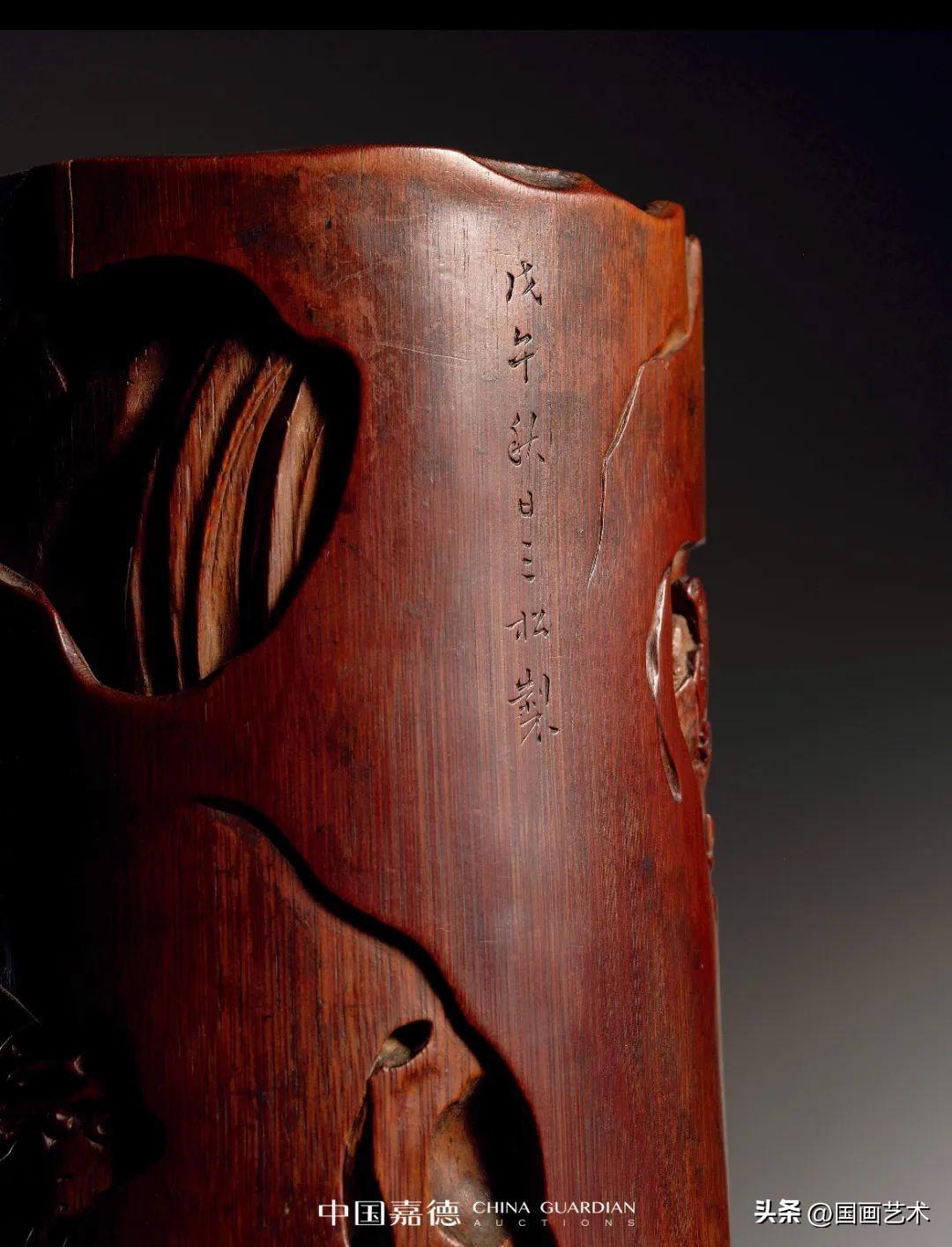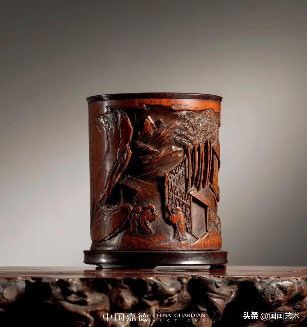 整體場景豐富,人物關係的梳理,以及主景的把握,着實巧妙,突出了故事主體性,將送別的不捨氛圍表現得淋漓盡致。筆筒一側巨石之上,陰刻杜甫《南鄰》七言詩句:“白沙翠竹江村暮,相送柴門月色新。”點明主旨,詩畫結合,頗可玩味。後落“筠谷書”款識。