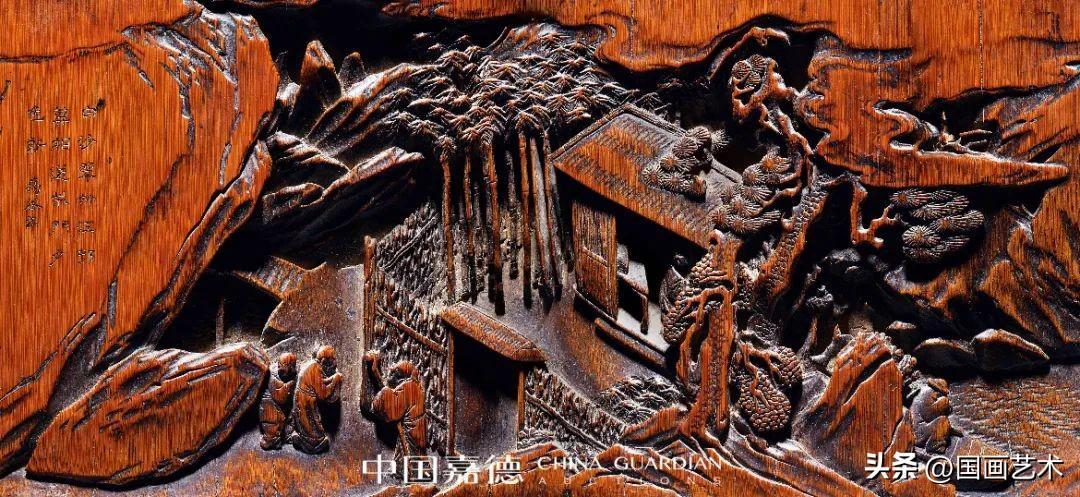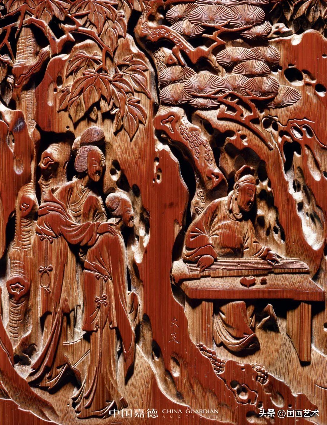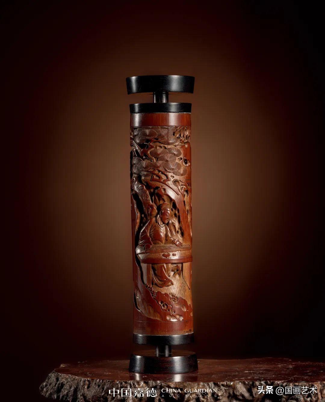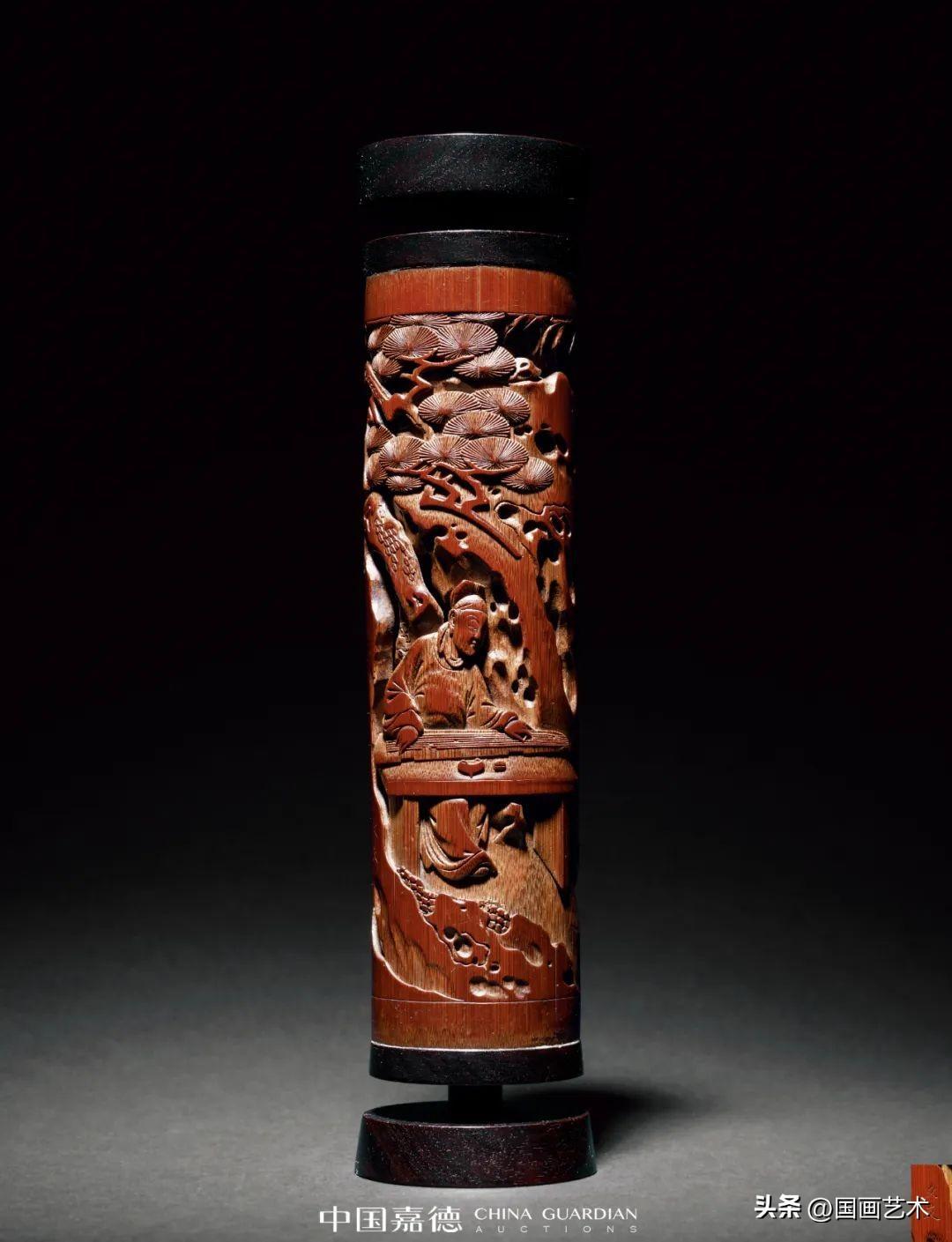 此竹香筒出自清代嘉定竹刻名家朱文友之手,通景式構圖,以減地高浮雕、透雕,輔以陰刻等技法,表現明末清初極爲流行的《西廂記》“張生巧遇崔鶯鶯”之境。