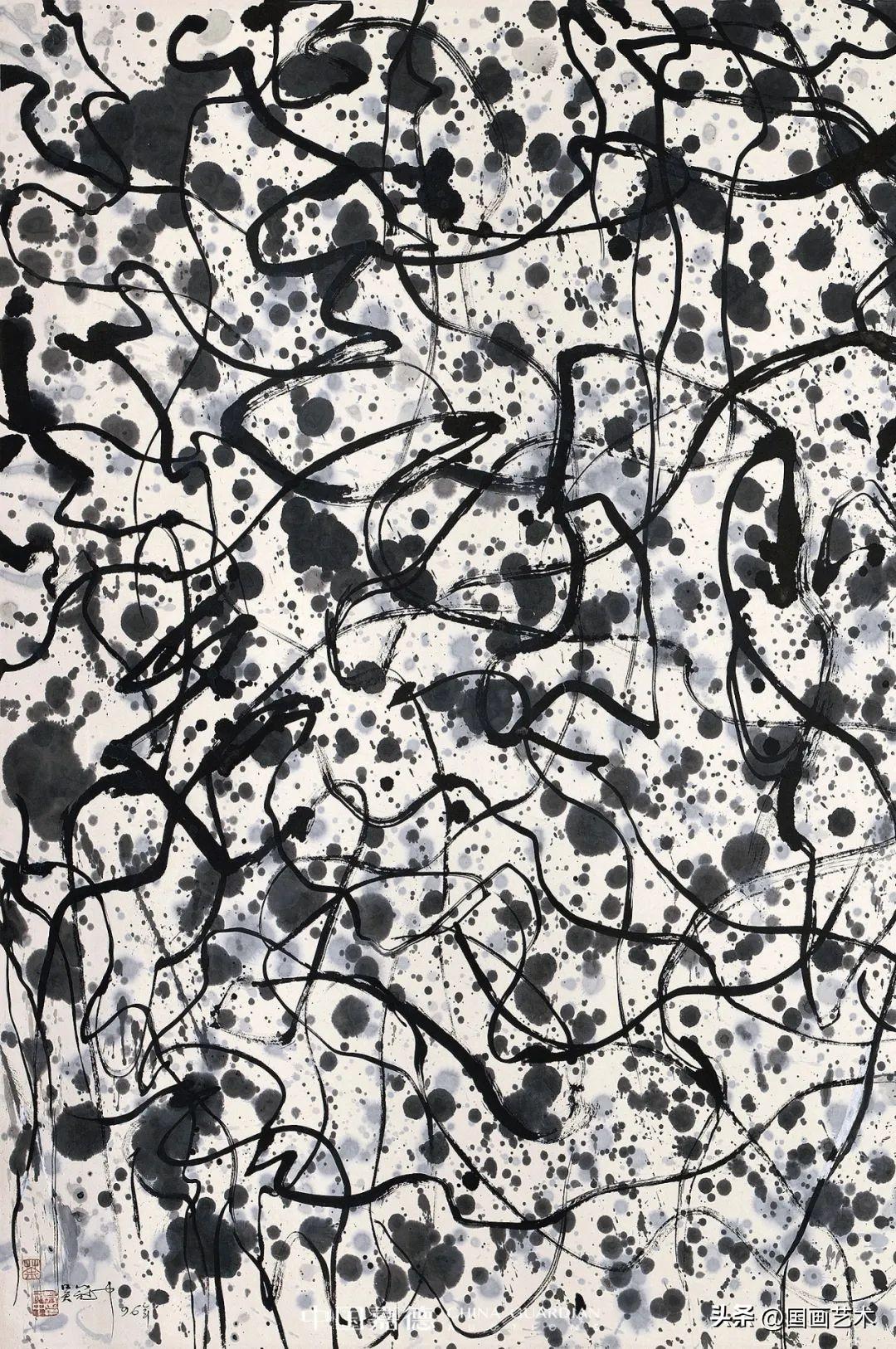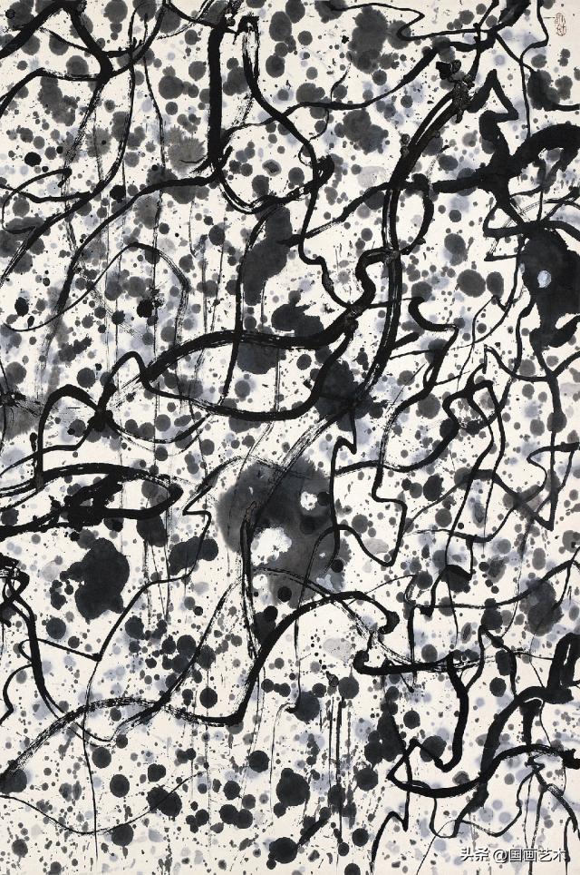 所以你看上去啊,好像它混混沌沌,但是每個部分又次序井然,而且最大一個特點,這個《野藤明珠》他用完全純黑白的這樣一個墨色,放棄了他原來的那個彩色雨的點,這也是他自身對徐渭的一種認識和理解。中國繪畫裏黑白就是陰陽的世界,一切由陰陽化生,生生不息之陰陽化生萬物,再加上徐渭他們那個時候,你可以看到他的作品基本上是黑白居多,“黑白”可以說是繪畫裏色彩世界中的軸心,任何彩色都不可能離開黑白,而吳先生這個時候呢,象徵着一個是他對徐渭的理解,一個是他的作品更加純化了。所以這張作品是吳先生的非常重要的代表作,反映了他整個晚年過程當中,“形式美”走向了一個無的、無我的,從無的角度,虛幻的鏡子裏看世界這麼一個境界,這是中國美術非常高妙的地方。