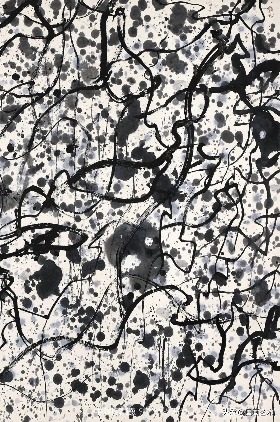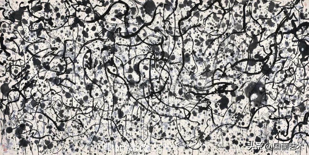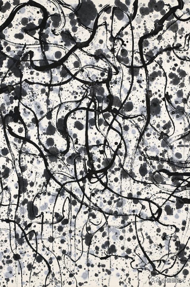 吳先生80年代的《獅子林》做了很大的誇張和想象,他把形變成了一個勢象。這個勢象無邊無界,但是看上去以後又是有限而無邊。而且在畫的過程當中,他特別發明了一個工具,就是一個膠皮大桶,上面裝着一個鐵嘴,他每次都是把墨灌進去,抱着它站在紙上游走。他爲什麼提出筆墨等於零呢?因爲筆墨對他來講不夠他用,限制了他,他要畫很長的線,他要像舞蹈一樣奔騰在這地上去噴灑流滴,這最能體現他情感的律動。