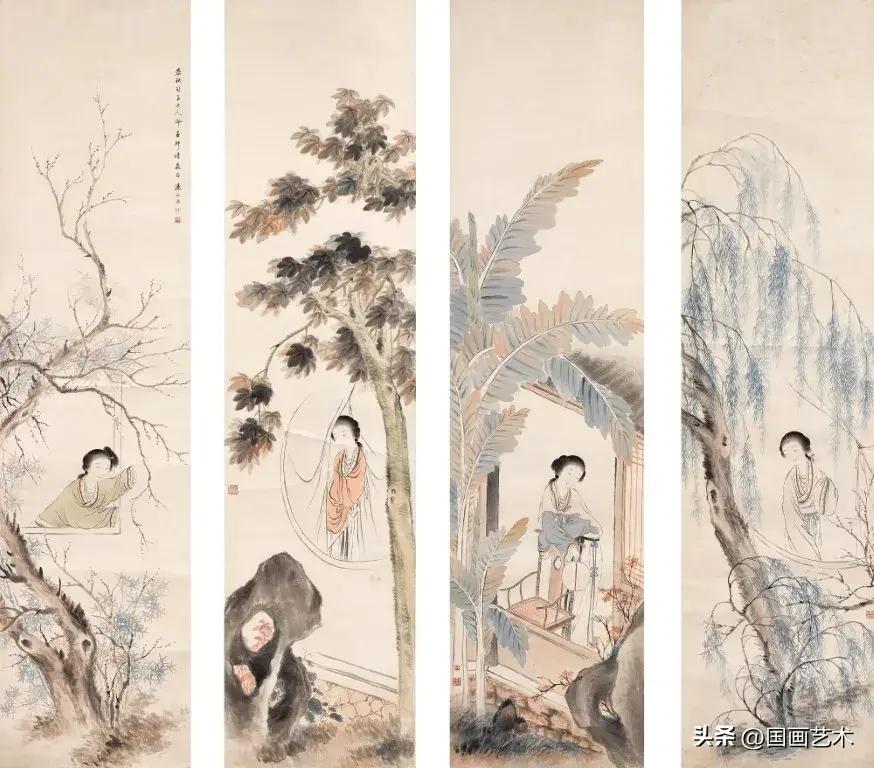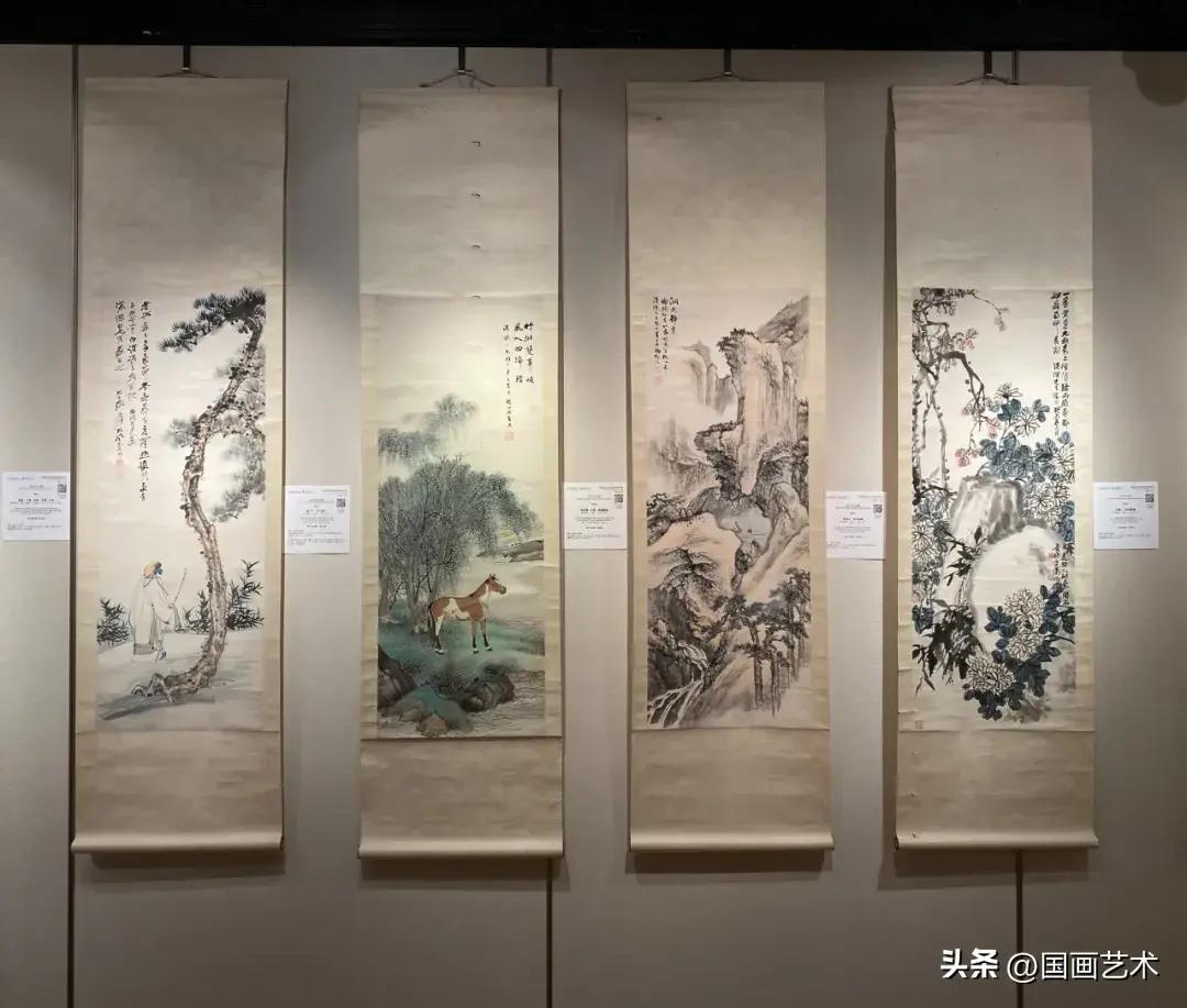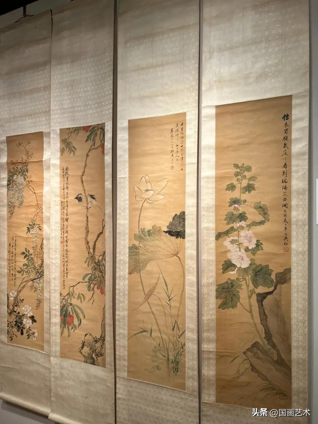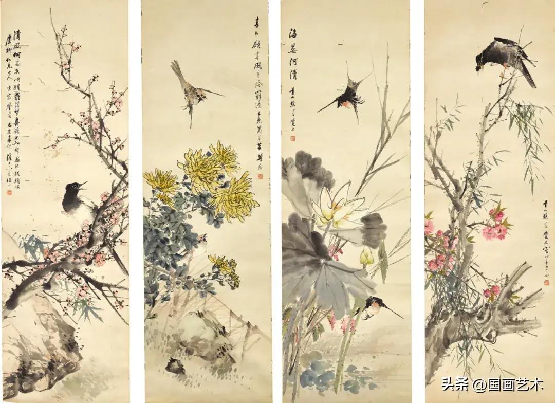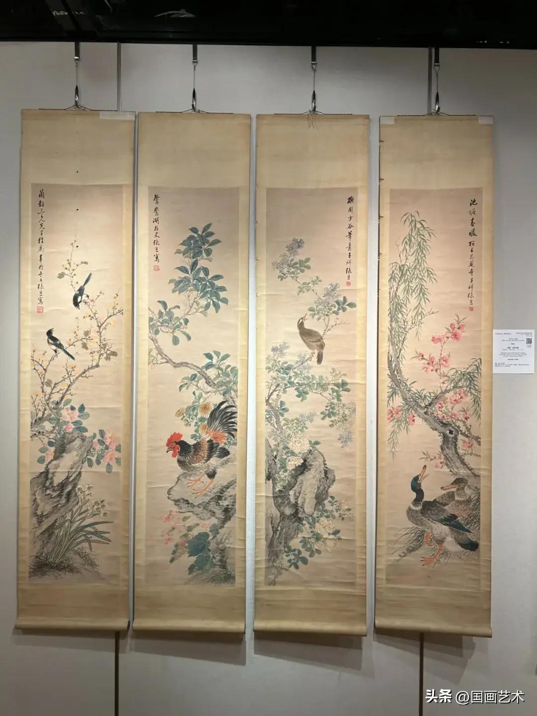 編號9013-9016同爲「漢傑」上款,其人待考,諸作分別寫於一九四一至四六年,題材廣涉山水、花卉、走獸、人物,惟尺幅相同,或應上款人要求而制,合裝爲四屏。