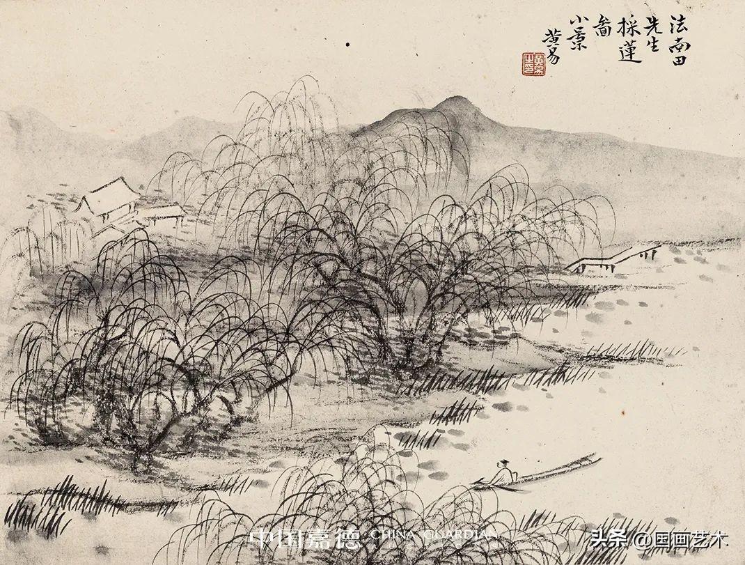 其嫩者,如柳枝、修竹、垂蔓、汀草,細嫩潤澤,用筆流利自如,線條富有彈性,有欣欣向榮之感。如本冊第三幅採蓮圖小景,岸邊翠柳的枝條以枯筆與嫩筆交錯寫成,舒捲靈動,疊出茂密如煙的夏日盛景。