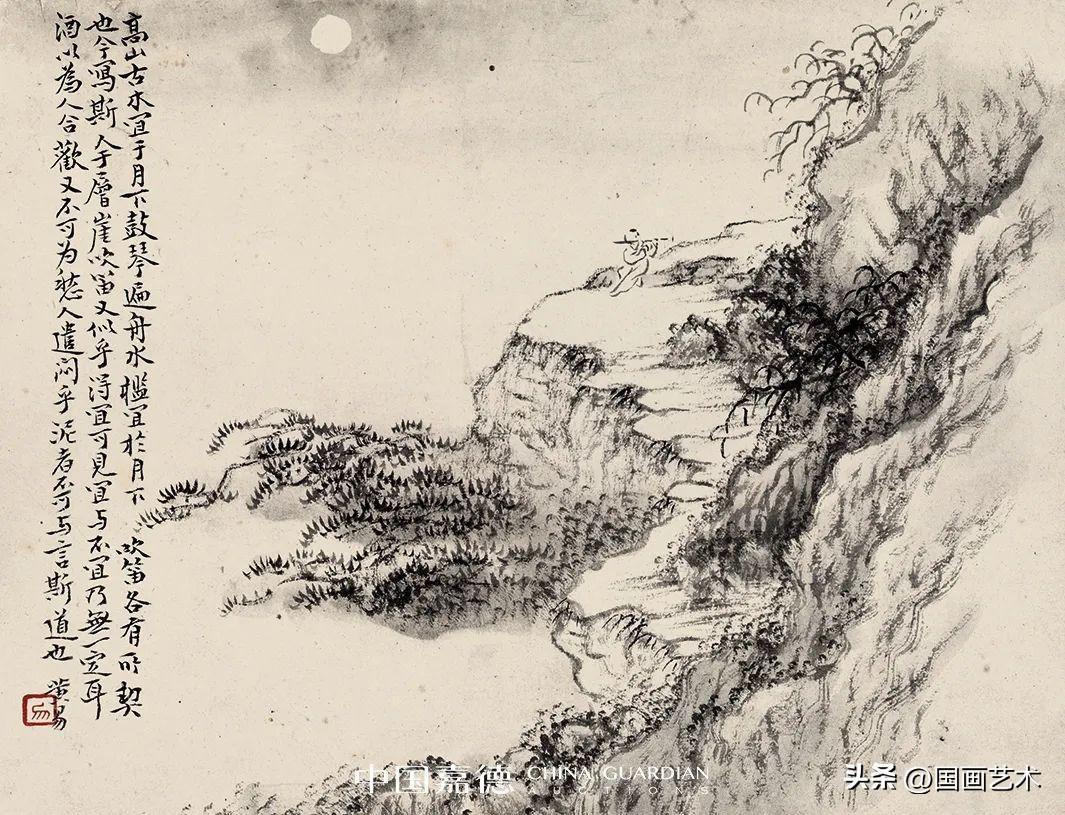 黃易人情達練,胸懷若谷,畫風古雅有遠韻,從本冊第四幅山水可窺一斑。其本言高山古木的意象與月下鼓琴相襯,遍舟水檻和月下吹笛的意境相和,而“今寫斯人於層崖吹笛,又似乎得宜,可見宜與不宜,乃無一定耳。”可見黃易在藝術學習與創作中既注重取法多家,但絕無泥古之思想。