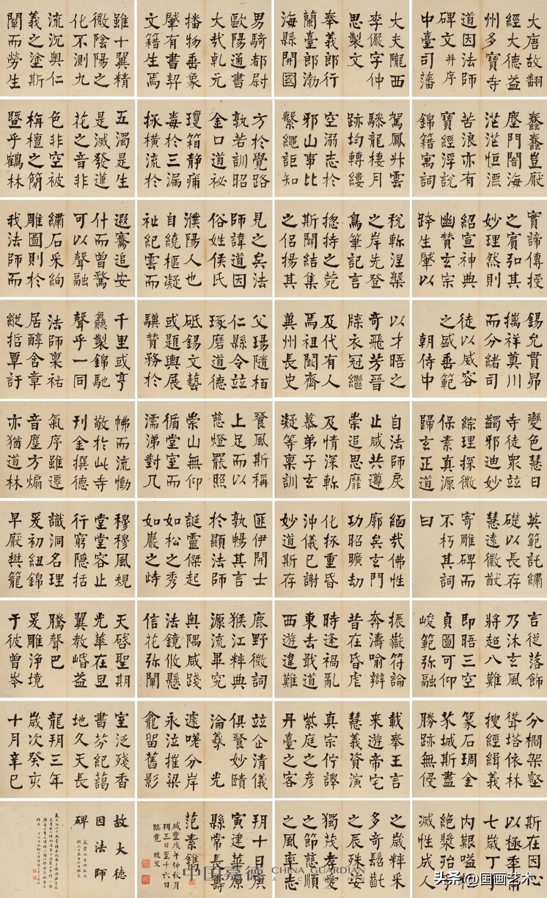 何紹基作於咸豐八年(1858)仲秋月(八月)朔三 日至十六日的《楷書臨道因碑》,正好印證了這一 猜想。從何維樸 1914 年對這件作品的題識:“是年 (1858)臨此碑兩通,李北海《麓山寺碑》一通,顏魯公《李元靖碑》一通”,可察,該作應是何紹基在1858這一年裏所臨《道因碑》兩通之一。