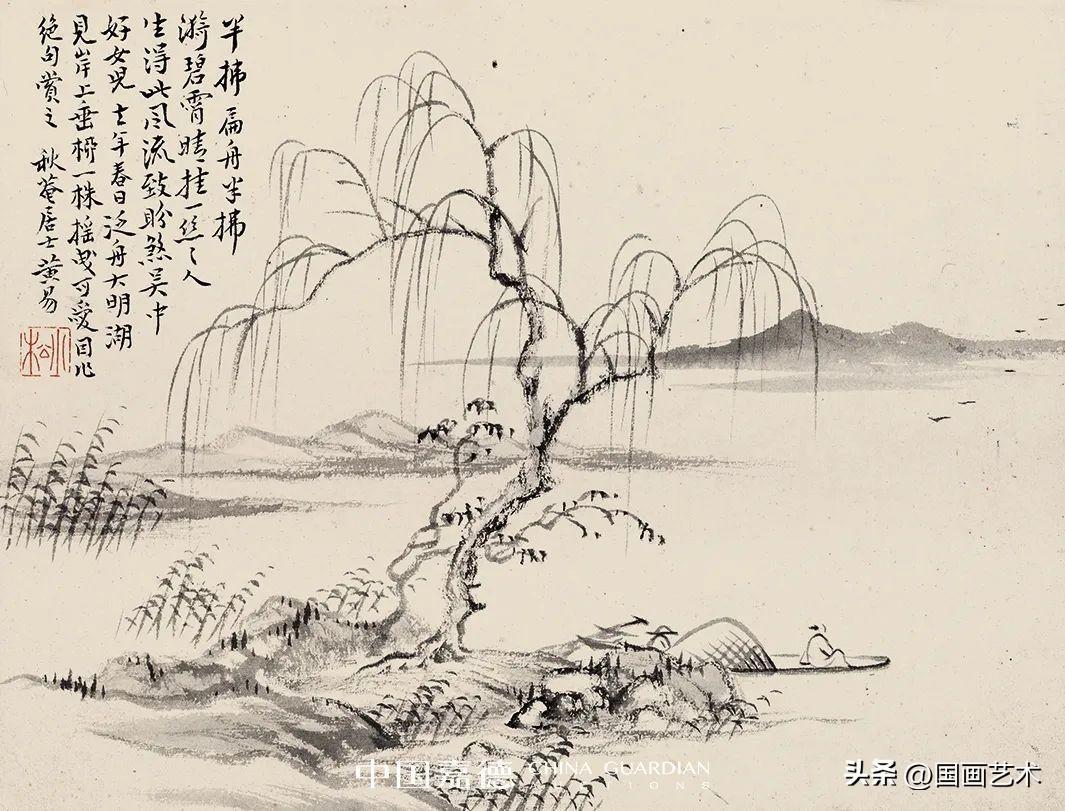 畫面大片留白作水天一色,一株才抽條吐綠的春柳婀娜伸展,半拂扁舟,半拂漣漪。近景的淺灘、沙洲、樹幹皆以幹筆渴墨寫成,絲絲縷縷的飛白墨痕與遠山的空濛水色交疊生趣,沿着舟中人遠眺的目光,可見一行飛鳥遙遙振翅。心境、詩意、圖景相和,一派躊躇滿志。