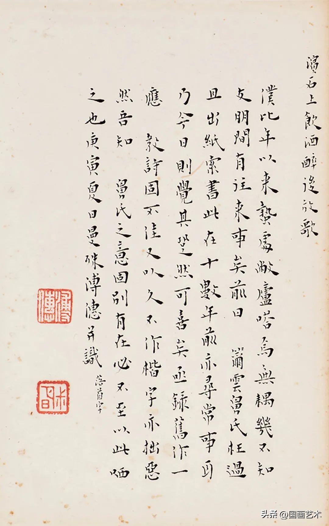 題識:月夜與岦侄坐海濱石上飲酒醉後放歌。僕比年以來蟄處敝廬,嗒焉無耦,幾不知友朋間有往來事矣。前日籋雲舅氏枉過,且出紙索書。此在十數年前亦尋常事耳,乃今日則覺其跫然可喜矣。亟錄舊作一首應教,詩固不佳,又以久不作楷,字亦拙惡。然吾知舅氏之意,固別有在,必不至以此哂之也。庚寅夏日曼殊溥僡並識。