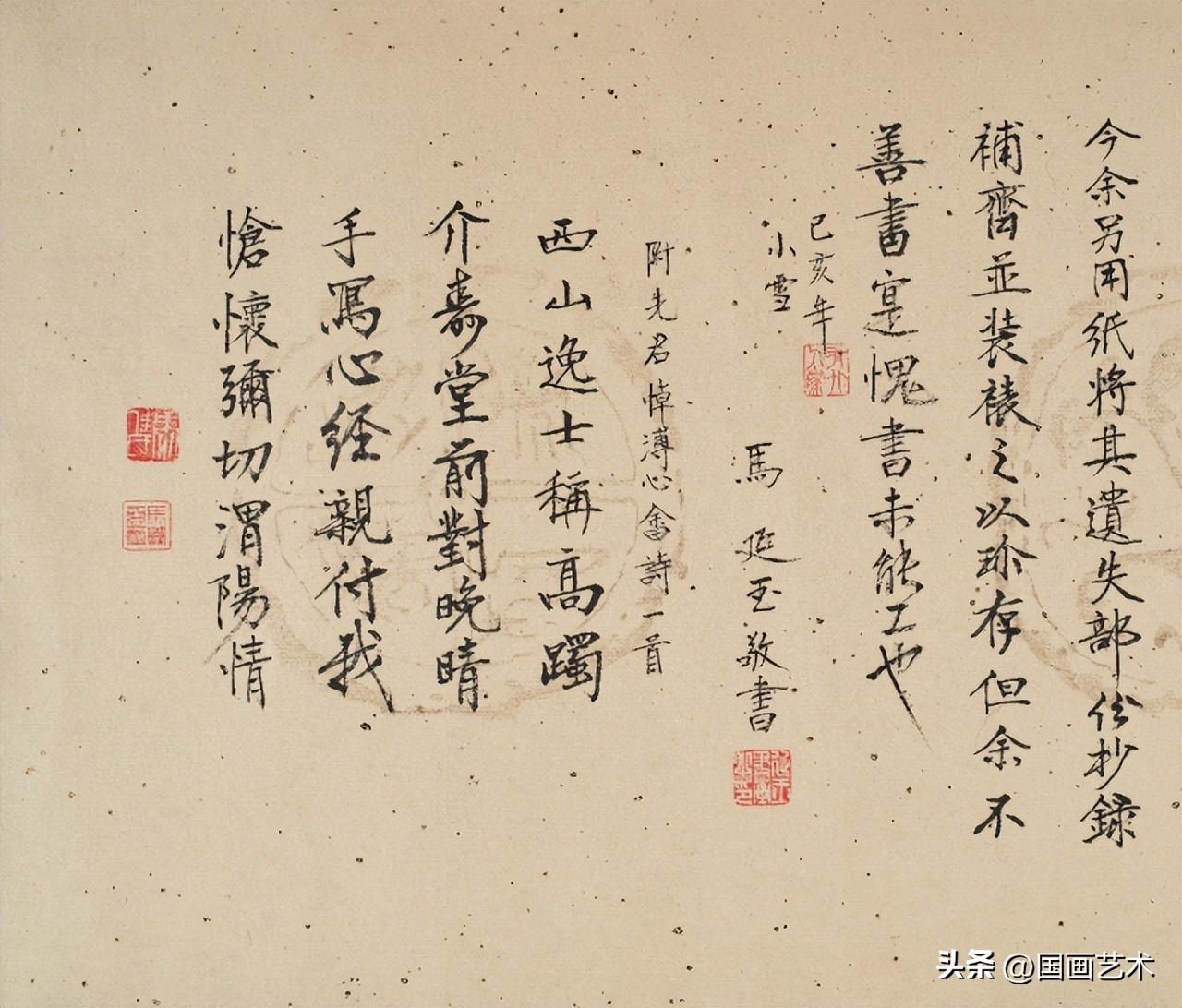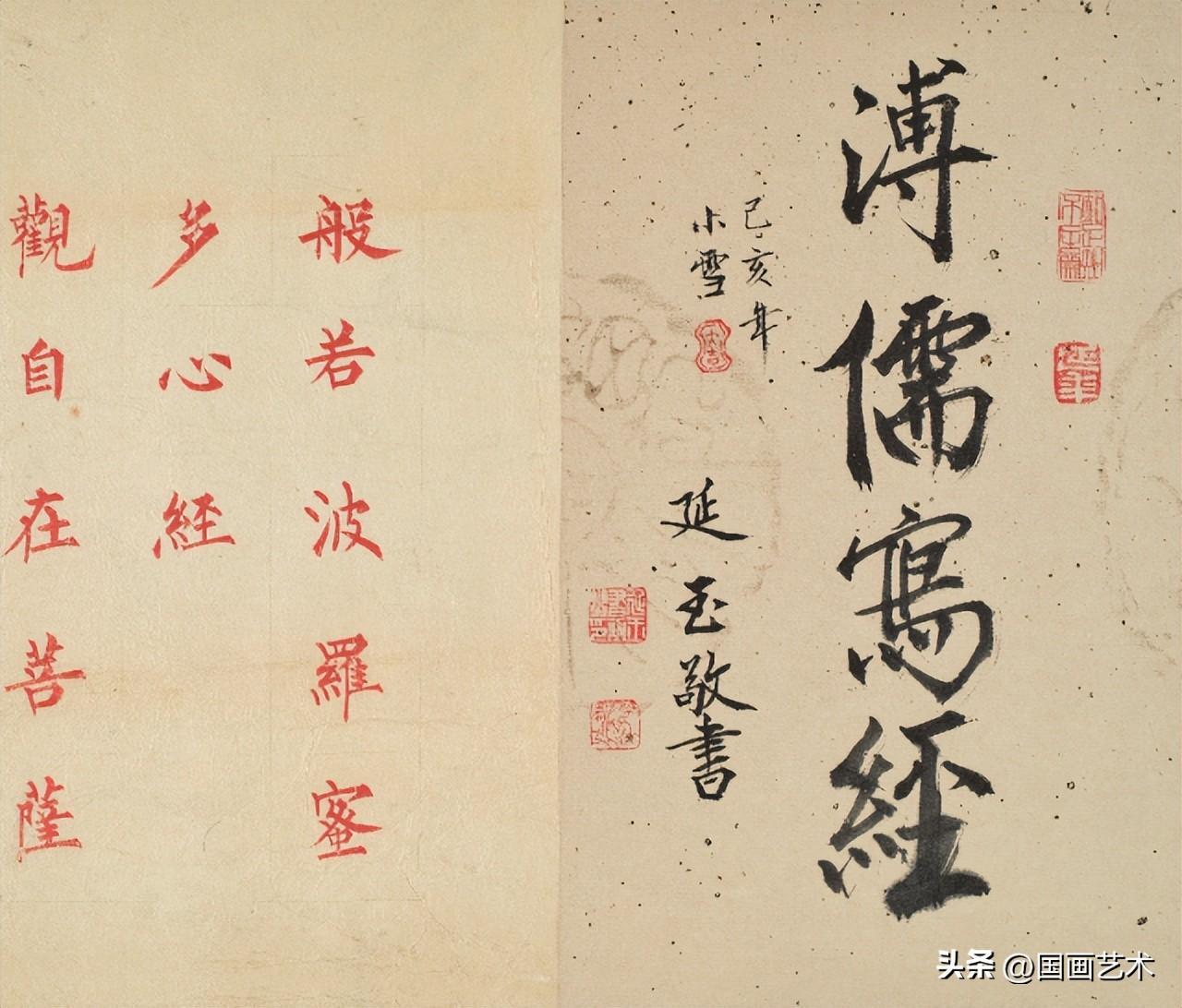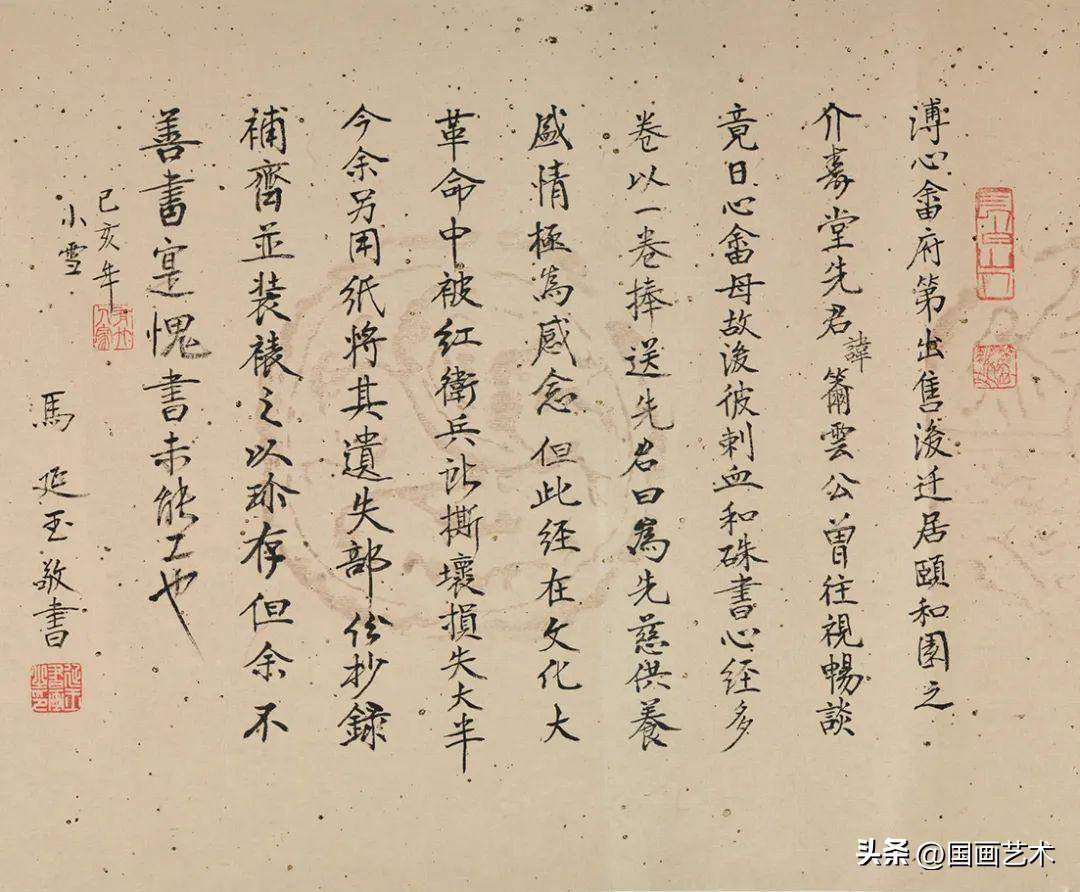 馬延玉題識:溥儒府第出售後遷居頤和園之介壽堂,先君諱籋雲公曾往視,暢談竟日。心畬母故後,彼刺血和硃書心經多卷,以一卷捧送先君,曰爲先慈供養。盛情極爲感念。但此經在□□□□□中被□□□所撕壞,損失大半。今餘另用紙將其遺失部份抄錄補齊,並裝裱之以珍藏。但餘不善書,實愧書未能工也。己亥年小雪,馬延玉敬書。