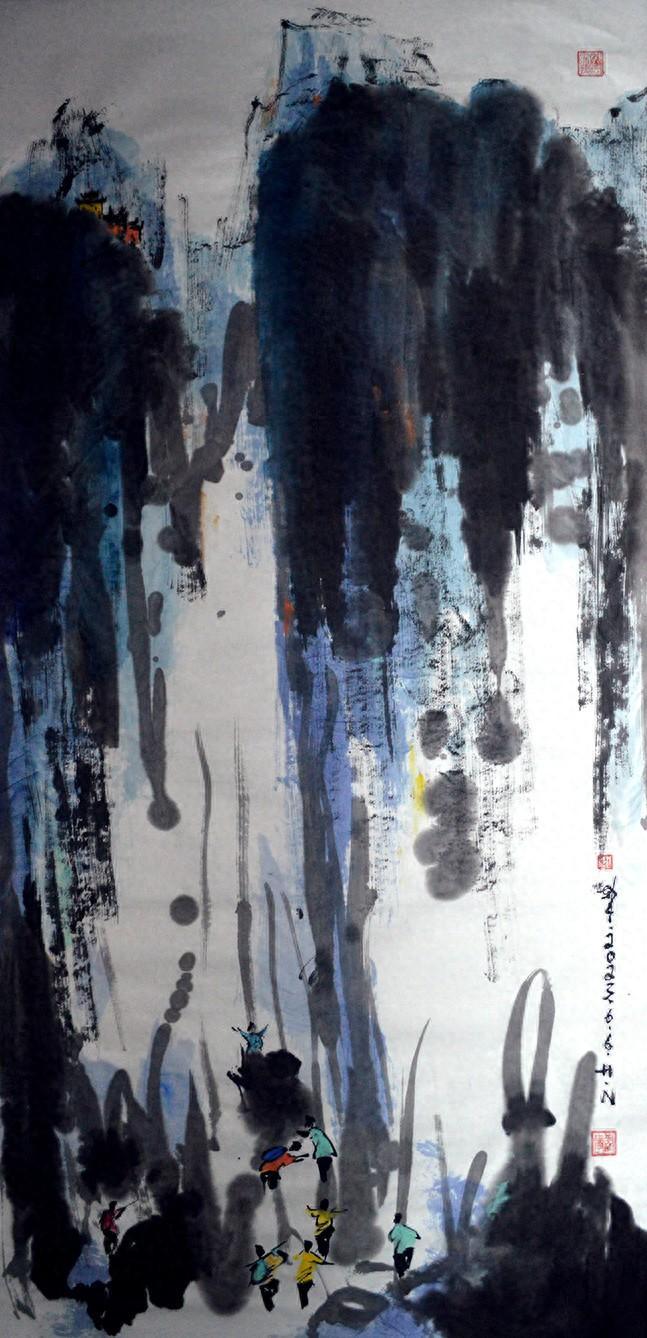 畫面處理的尺度分寸,及表現與佈局,黑白灰水墨與符號色彩等,相互之間的關係把握使之體現出來我們的情緒和情懷以及格局。我們畫山水還是畫花鳥畫都是表現人的感懷,而不一定是畫人才能表現人的心情與情感。如果說畫人及人的神態是第一人稱,畫山水、花鳥就是第二和第三人稱了。