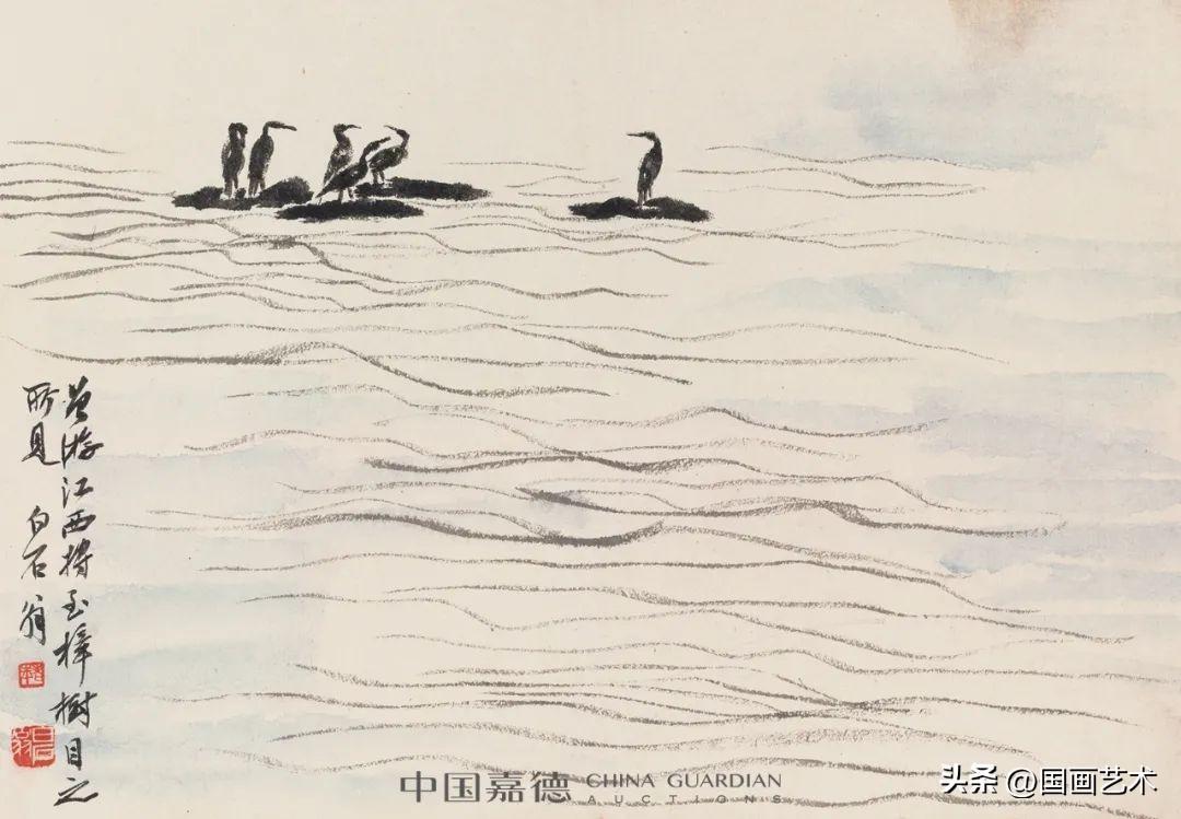 “江上水鳥”一開爲齊白石遊江西,至樟樹所目之景,棲息在水面上的水鳥相互顧盼,律動的橫線是靜而大的湖水,極淺的藍色染了幾筆,於是洞庭碧水的煙波浩渺如在眼前。水面加水鳥的模式齊白石非常愛用,齊白石對水天一色、落霞孤鶩的景象記憶極深,這種極簡的構圖十分符合齊白石“樸”的思維方式,簡明扼要又形式感極強,所以這種圖式也逐漸成爲白石最會做的“拿手菜”。