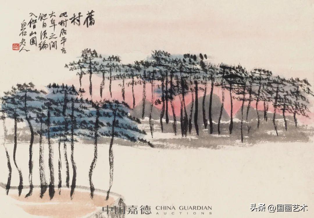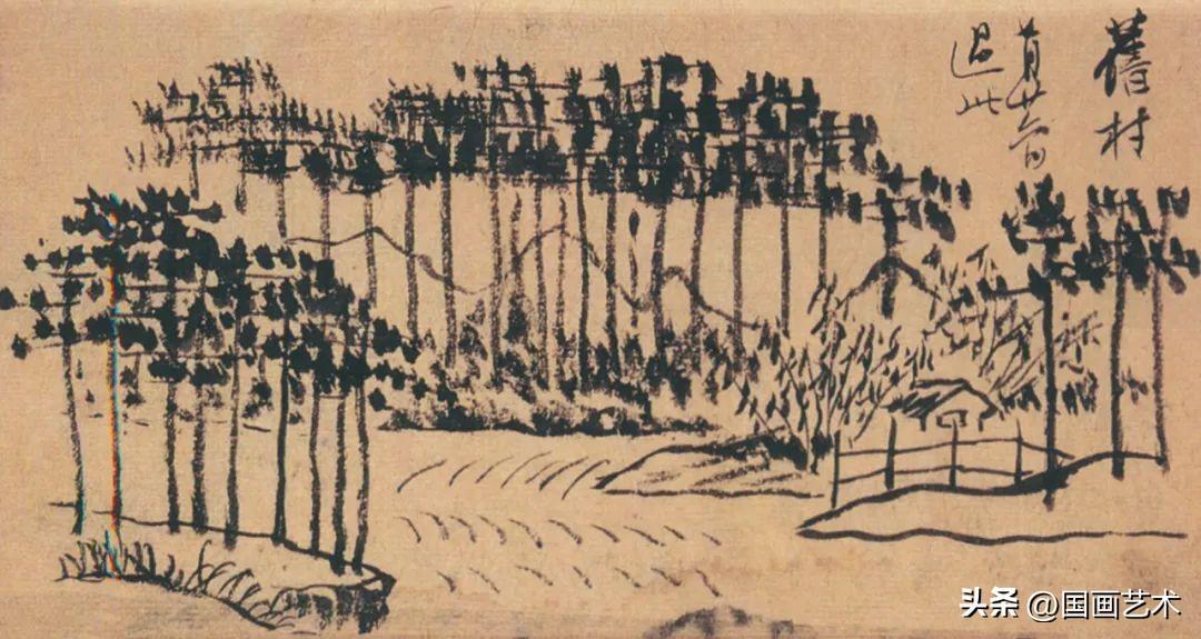 北京畫院藏齊白石1909年作《寄園日記山水稿》四頁中有其在廣西北海所得寫生稿,其中一幀題即爲“舊村”,依此我們可知 “舊村”之景爲齊白石1909年於廣西北海所得。此開亦用紅色寫朝霞,圖式爲兩山夾一水,主要景物是平攤淺岸上反覆排列的樹木。這裏的樹木與“星塘老屋”和“杏子塢”裏的樹顯然不同,樹無枝杈,樹冠茂密,樹幹高而直,密匝排列,齊白石用鬆快的線條和清爽的石青把這些整整齊齊的樹並行描寫,又安排的大片留白形成反差,配以紅霞,呈現出了一種全新的視覺感受。
