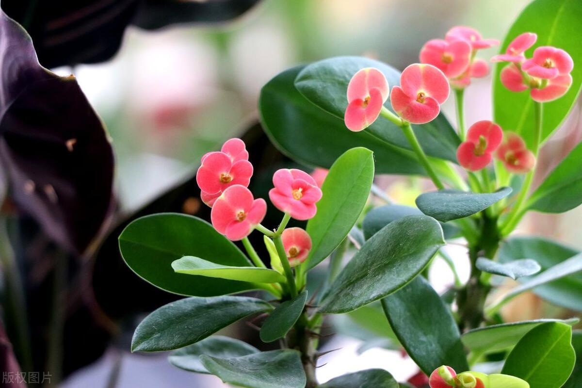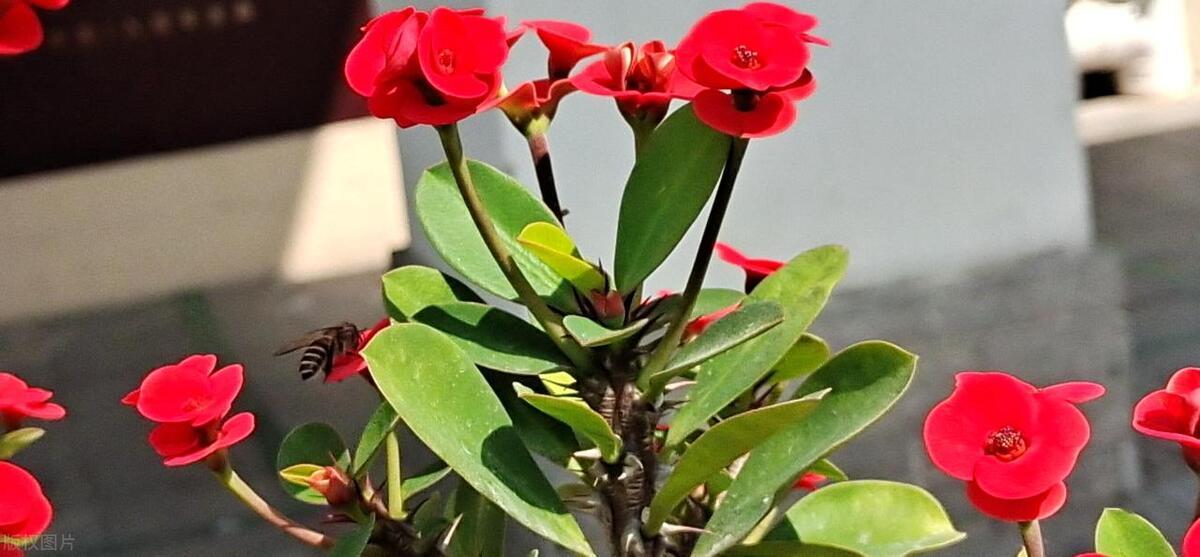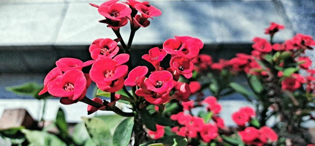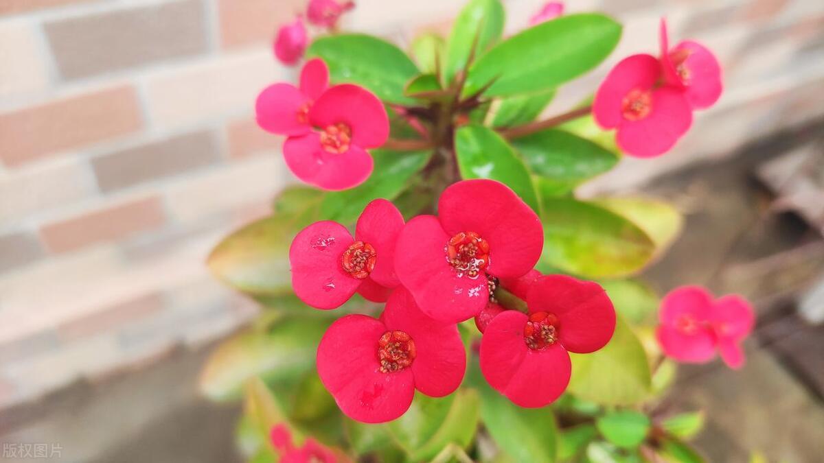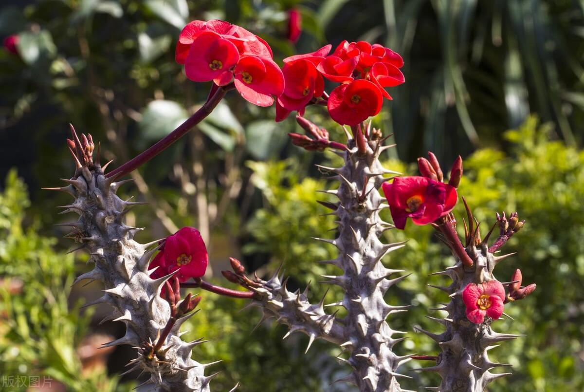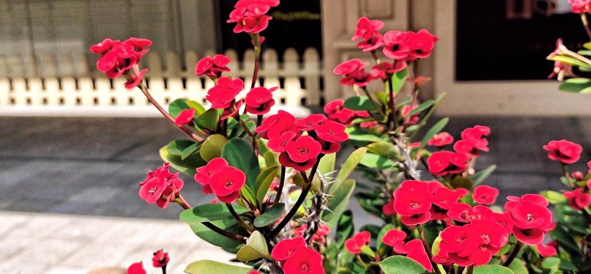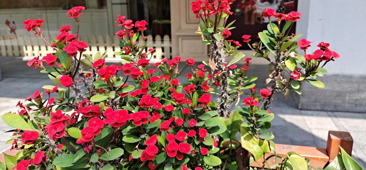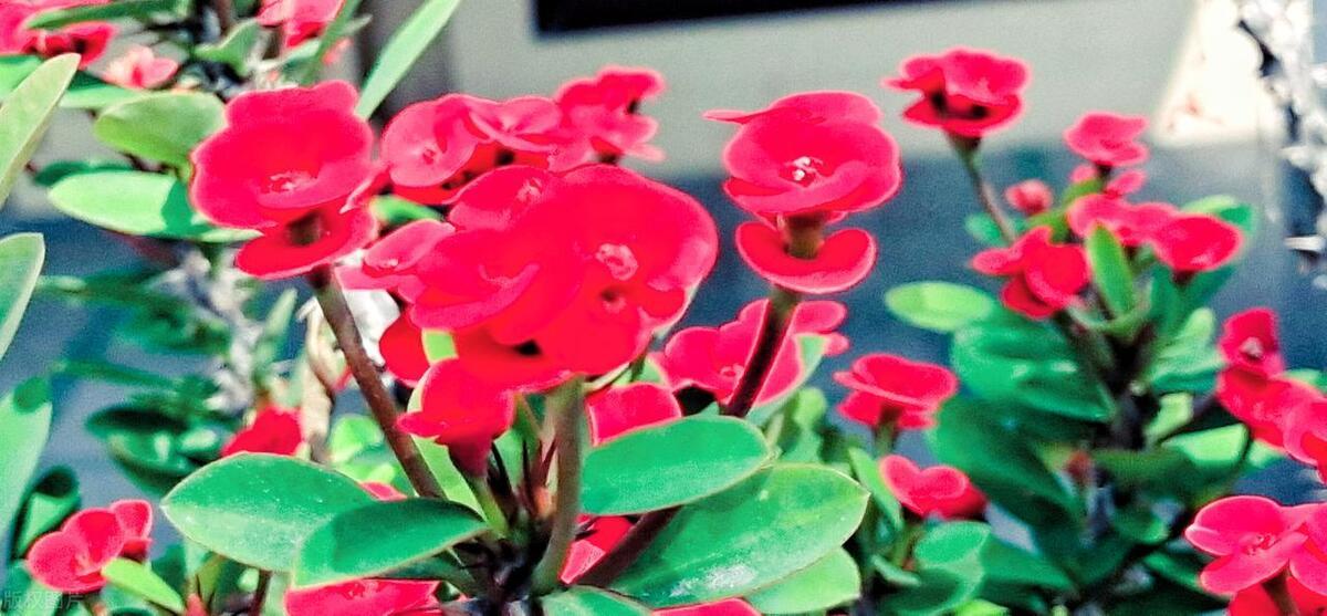 注:虎刺梅又名鐵海棠,原產非洲馬達加期加島。喜溫暖溼潤和陽光充足環境。耐高溫、不耐寒。以疏鬆、排水良好的腐葉土爲最好。冬季溫度不低於12℃。 虎刺梅勇猛儒雅謂忠誠,青莖刺枝花珍貴。倔強而又堅貞,溫柔又忠誠,勇猛又不失儒雅。虎刺梅大概是最小巧的花朵,不像杜鵑花那樣燦爛似錦,也不如水仙那樣純潔高雅,更比不上牡丹的豔麗富貴,卻也活得像模像樣,枝頭上依然開着小花蕾粉嫩可愛,入花木凋零的冬季,只有虎刺梅凌寒不敗,幾朵鮮紅的小花綻放其間,愈顯得風姿綽約,倒給居室增添了不少春意。鐵灰色的虯枝,堅硬勁枝若斧削成,尖硬的針刺佈滿了枝幹,骨力昂然地挺出一個凜然不可侵犯的季節意象:枇杷樣的葉子嫩而綠,修而長,如今已是綠油油、滿盈盈的一盆,將人自然引入琶音黯然、美人何在的深入懷想;枝頭蝴蝶似的小紅花,每兩瓣爲一小朵,再組成不大的一簇,夏綠冬紅的似着癡守不棄的愛之誓言。