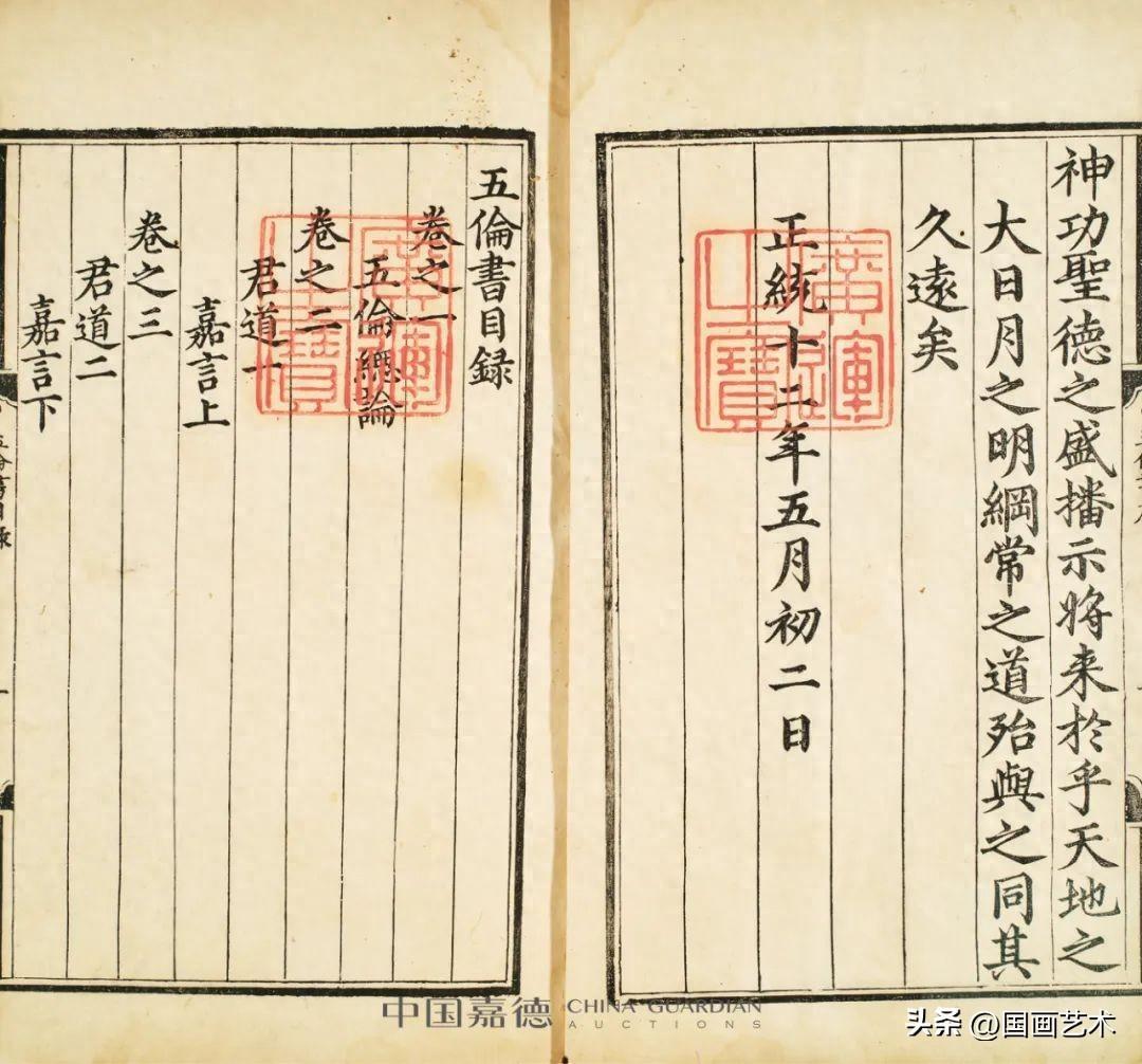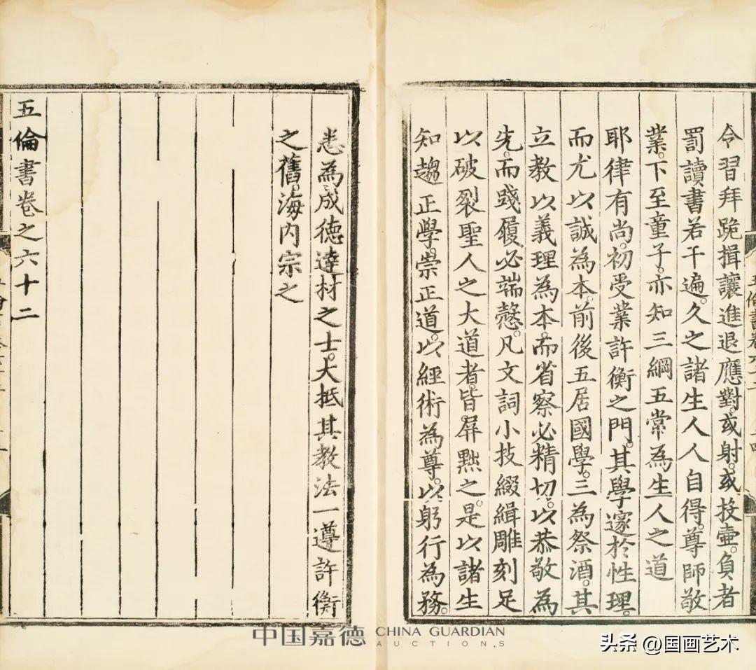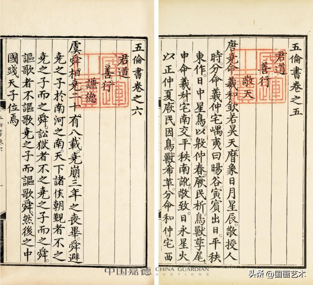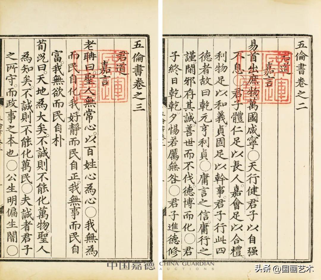 2024中國嘉德春拍古籍部徵得元及明初刻本九種,其中明正統十二年(1447)內府刻本《五倫書》爲明初皇家刻書珍品,鈐內府“廣運之寶”朱文印六十次,上好潔白棉紙以佳墨精印,版式闊大,字體上承元代遺風。元大德間三山郡庠刻本《通志(存二卷)》開本闊大,內容爲三國時期孫吳名士周瑜、魯肅等人列傳。此外,又有明嘉靖前明初期刻本六種,全部爲白棉紙印本,可見明初承襲元代刻書的獨特風貌。