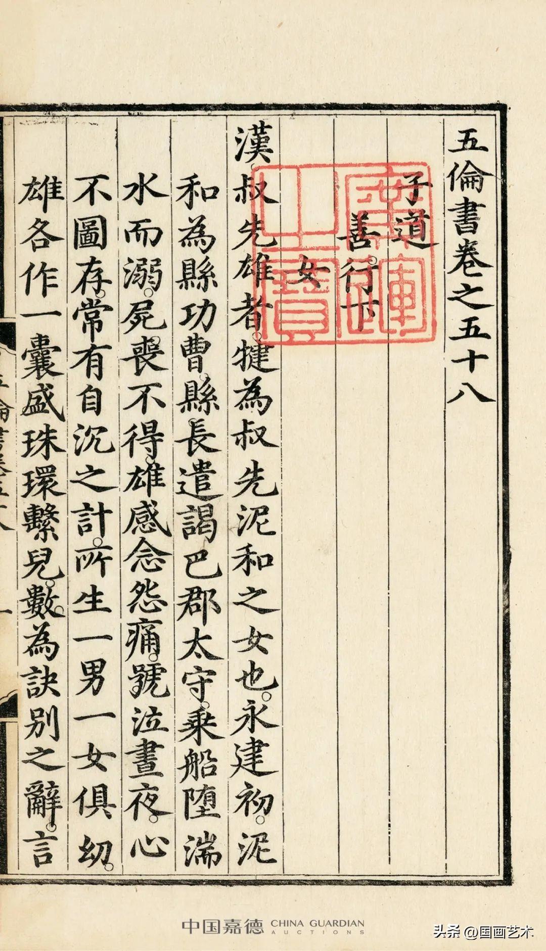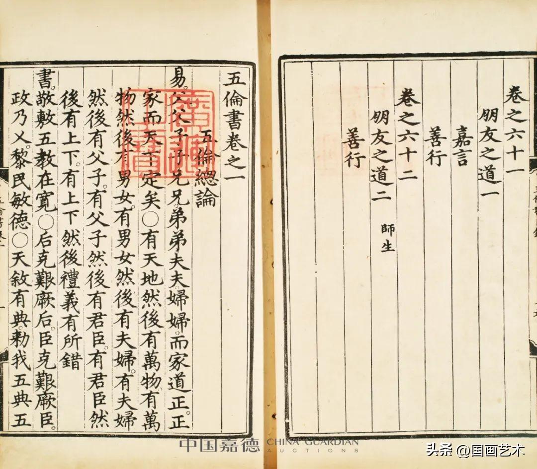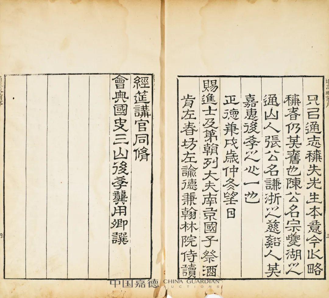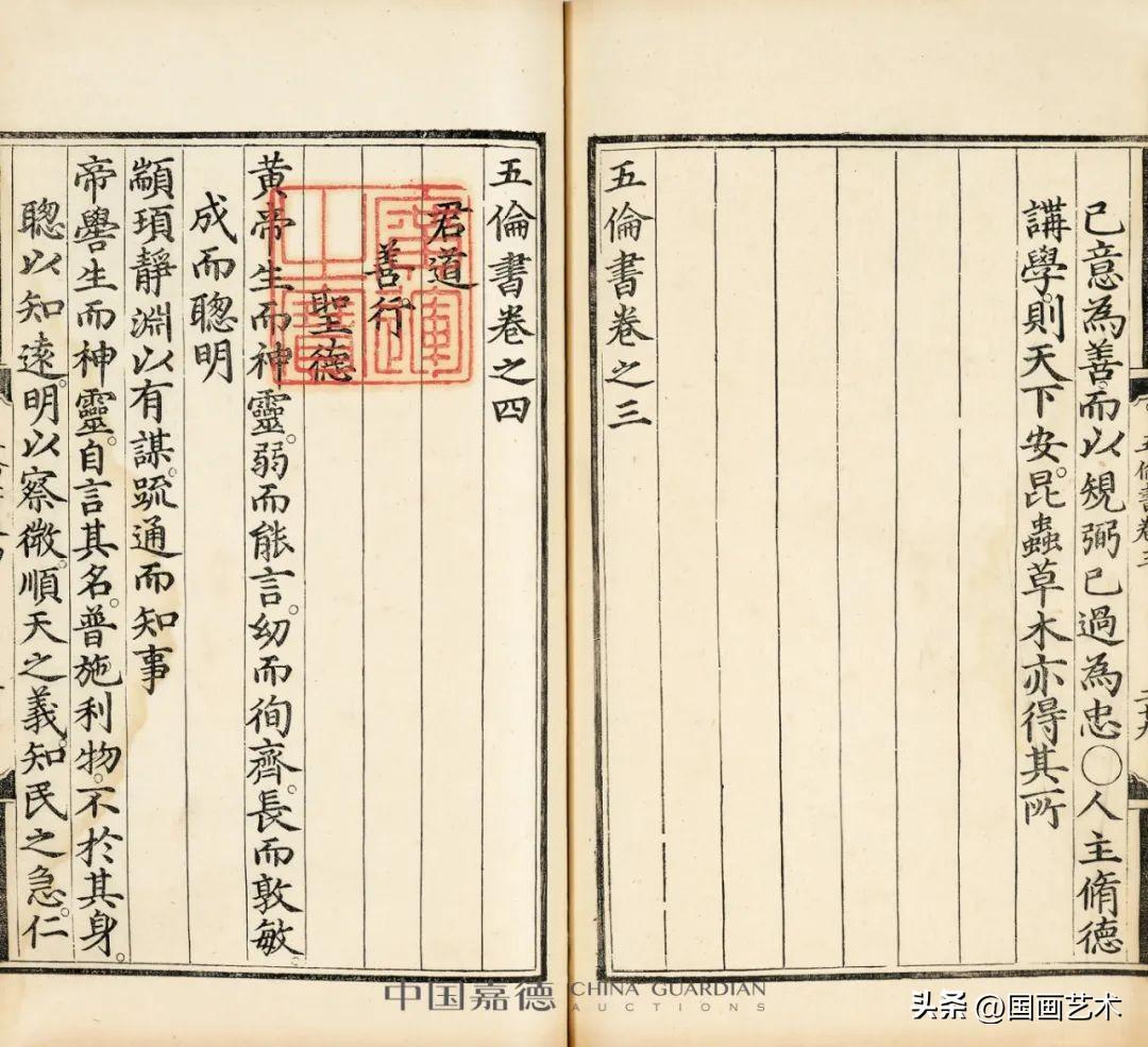 2024中國嘉德春拍古籍部徵得元及明初刻本九種,其中明正統十二年(1447)內府刻本《五倫書》爲明初皇家刻書珍品,鈐內府“廣運之寶”朱文印六十次,上好潔白棉紙以佳墨精印,版式闊大,字體上承元代遺風。元大德間三山郡庠刻本《通志(存二卷)》開本闊大,內容爲三國時期孫吳名士周瑜、魯肅等人列傳。此外,又有明嘉靖前明初期刻本六種,全部爲白棉紙印本,可見明初承襲元代刻書的獨特風貌。