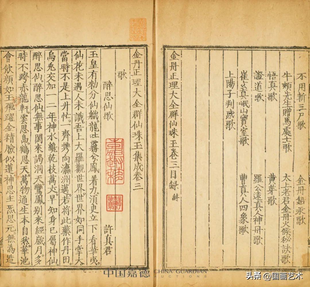 是書不著編輯者名氏,四部列於子部道家類。第一卷賦二十二篇,第二卷論十七篇,第三卷歌詞六十六首,第四卷爲錢道華《敲爻歌注》、李光元《海客論》。半葉十行二十一字,黑口,四周雙邊。黃棉紙印,明季原裝包背裝,甚爲難得。原書四卷,此存卷三。