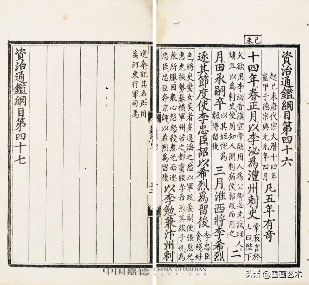 是書系宋代大儒朱熹在司馬光《資治通鑑》基礎上擇其要旨而成,所記自周威烈王二十三年(前403)起,到五代後周世宗顯德六年(959)徵淮南止。全書仿效《春秋》、《左傳》,創立了“綱”與“目”,後世稱爲綱目體。半葉八行十八字,小字雙行二十一,粗黑口,四周雙邊,雙魚尾。白棉紙精印,開本闊大,展卷盡顯明代初期內府刻書風範。原書五十九卷,存卷四十六、四十七。