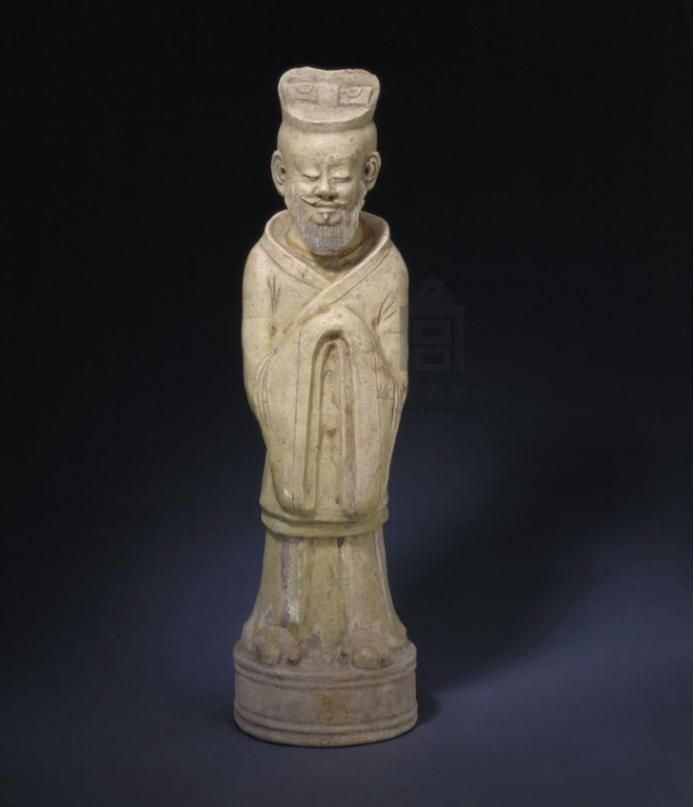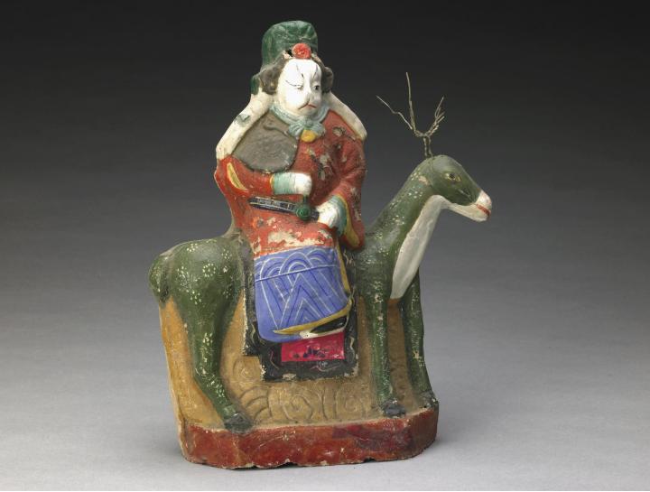清晚期·泥制兔兒爺,兔兒爺端坐在梅花鹿上,因“鹿”與“祿”諧音,借指“俸祿”,進而引申爲官職,表達了人們期盼官運亨通的意願