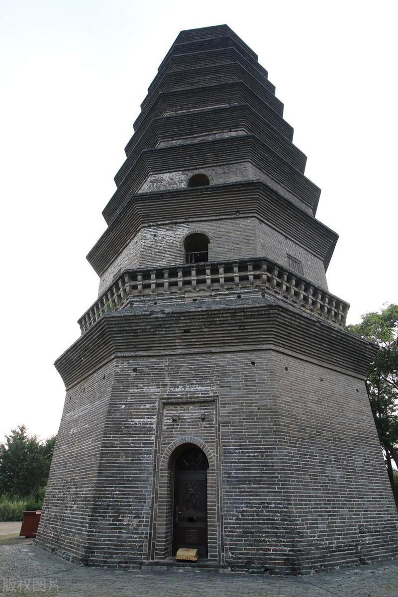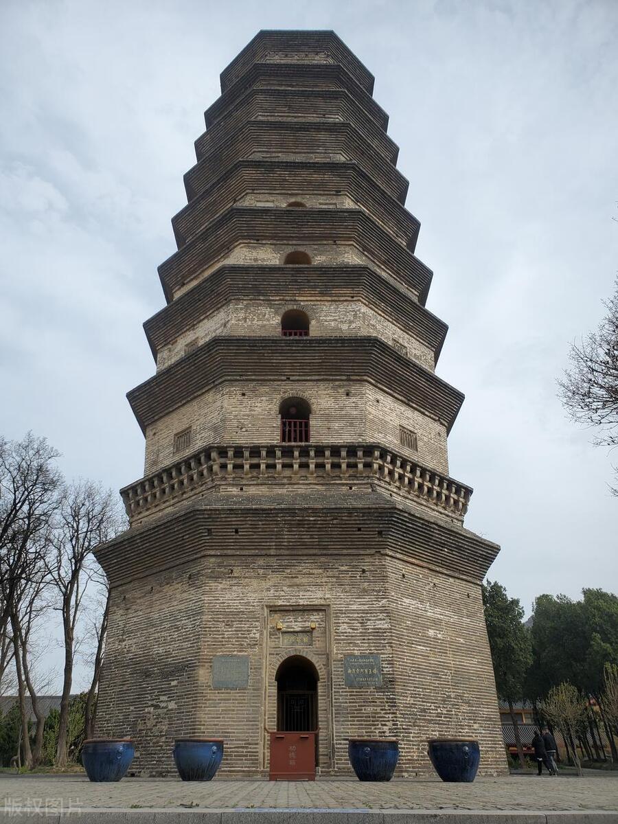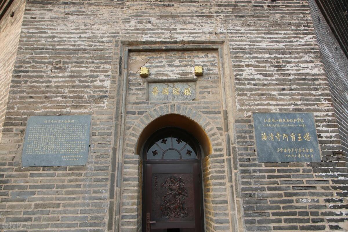 海清寺阿育王塔始建於北宋天聖元年(公元1023年),於天聖九年(1031年)建成,距今已有近千年的歷史,是江蘇北部歷史悠久、塔體最高的一座浮屠。明《隆慶海州志》描述它爲“峻宇修廓,萬山環拱,浮屠九級,矗兀層霄”。塔形爲仿閣樓式,九級八面,高40.58米,“上觀似從天降下,回徹清霄,下看似從地湧成,寶堂連海”。每級東、西、南、北各闢有券門,其餘四面隱出直欞窗,外壁內繞以走廊,中砌八邊形塔心磚柱,磚柱內有梯級踏步,可沿級而上剎頂。