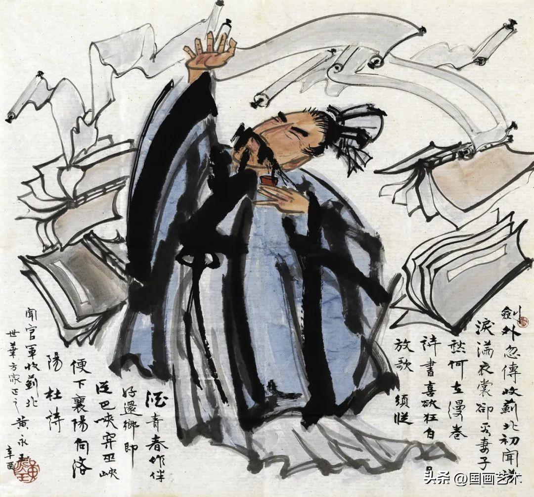 款識:劍外忽傳收薊北,初聞涕淚滿衣裳。卻看妻子愁何在?漫卷詩書喜欲狂。白日放歌須縱酒,青春作伴好還鄉。即從巴峽穿巫峽,便下襄陽向洛陽。杜詩《聞官軍收薊北》。世華方家正之。黃永玉,辛酉。