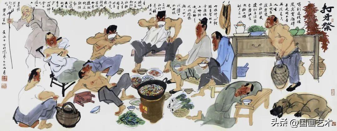 款識:打牙祭。喝到這種程度,其實酒罈子是用不着再提來了。人生在世,有這麼幾個好朋友,逢到弄得點什麼好東西,街上碰到了來一個眼神,心裏頭自然明白今夜該上哪裏去,這都是我們鳳凰縣一代一代傳下的老規矩。至於如何弄,根本用不着操心,只要打扮好肚子,自信有好多酒量,夜間關照哪個來接就行。這類活動好像天生的,由老至少,心領神會而已,談不上遺傳因子問題的。癸未夏初,黃永玉寫於鳳凰玉氏山房。