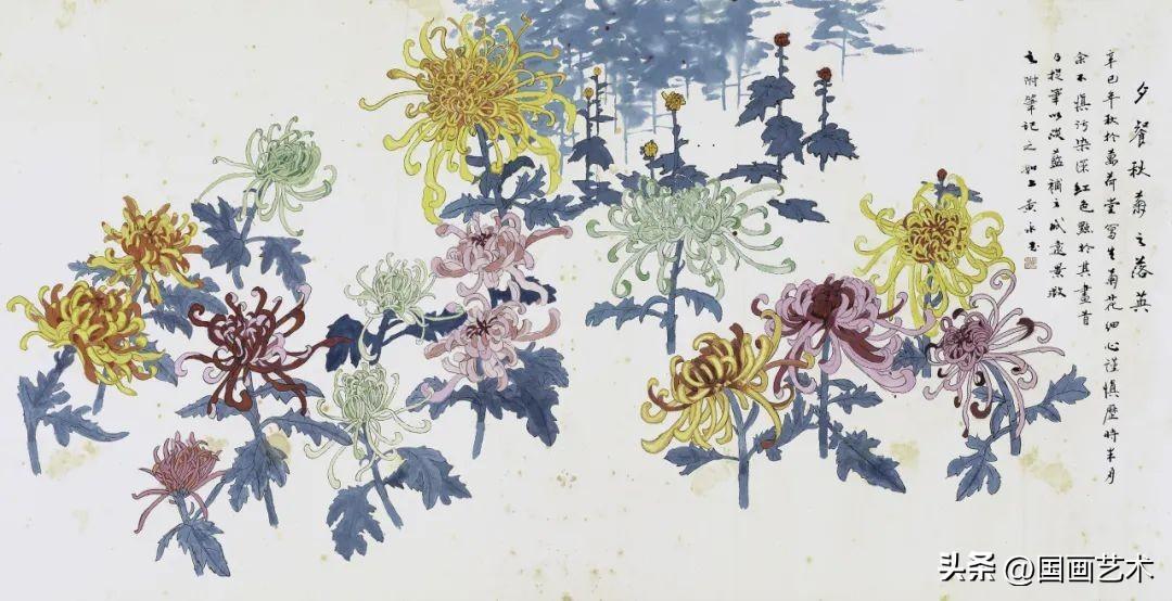 款識:夕餐秋菊之落英。辛巳年秋於萬荷堂寫生菊花,細心謹慎歷時半月餘,不慎污染深紅色點於其畫首,乃捉筆以淡藍補之成遠景救之,附筆記之如上,黃永玉。