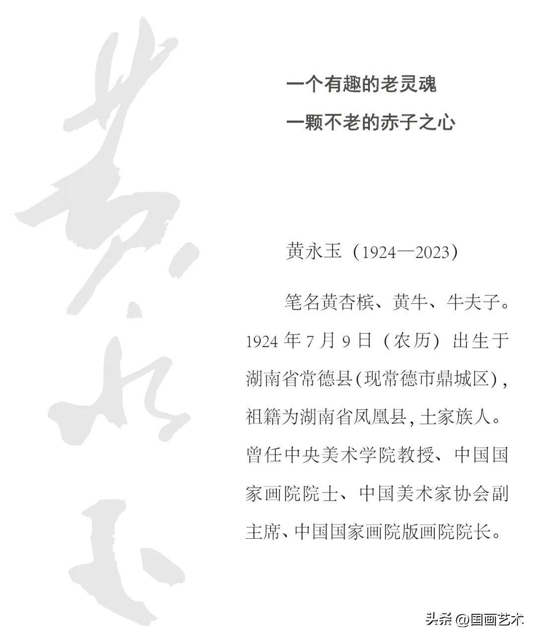 本次展覽的作品,遴選了黃老從五十多歲到九十多歲之間創作的53幅書畫,12件雕塑作品,題材很豐富的包含了花鳥、生肖、山水、人物等系列,其中花鳥系列裏有幾幅不同時期非常有代表性的作品,比如早期的《夜荷》,雙題跋的《吳昌碩詩意圖》,2007年爲好友香港著名音樂家顧嘉輝創作的《念橋邊紅藥 年年知爲誰生》,以及5米巨幅重彩荷花《香滿洞庭波》;山水系列裏《我見青山多嫵媚》《江山雪霽》等都是黃老八十年代的精品,人物系列裏丈二尺幅的《打牙祭》詼諧、生動、豁達的講述了酒逢知己千杯少的中國文化。