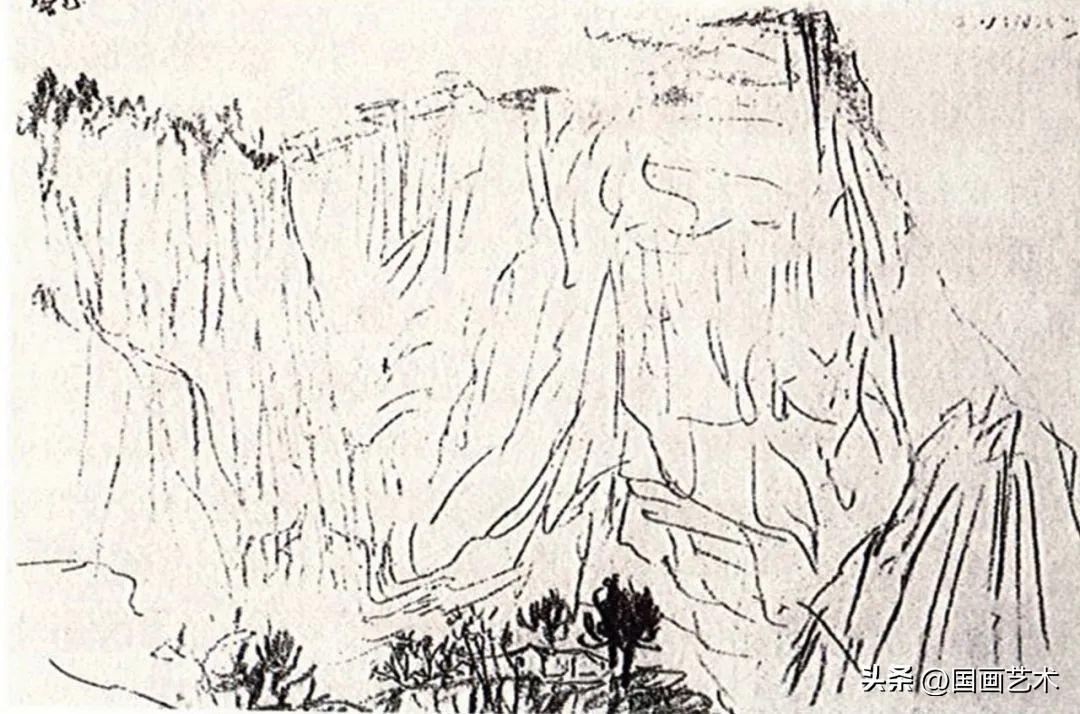 面對這一切,長年居於江南的傅抱石內心受到了強烈的震撼,目睹太華奇峭的西峯雄姿和變幻的煙雲,不無感慨:“對於長期生活在平疇千里的江南水鄉的山水畫家,對於長期沉潛在卷軸几案之間的山水畫家,一旦踏上了‘天下險’的華山,您能禁得住不驚喜欲狂嗎?”他在青柯坪停留數小時,觀其氣勢,察其形態,速寫西峯、青柯坪和東西兩側諸峯,以扼要簡練的線條速寫畫稿多幅,爲稍後的華山創作積累了豐富的素材。