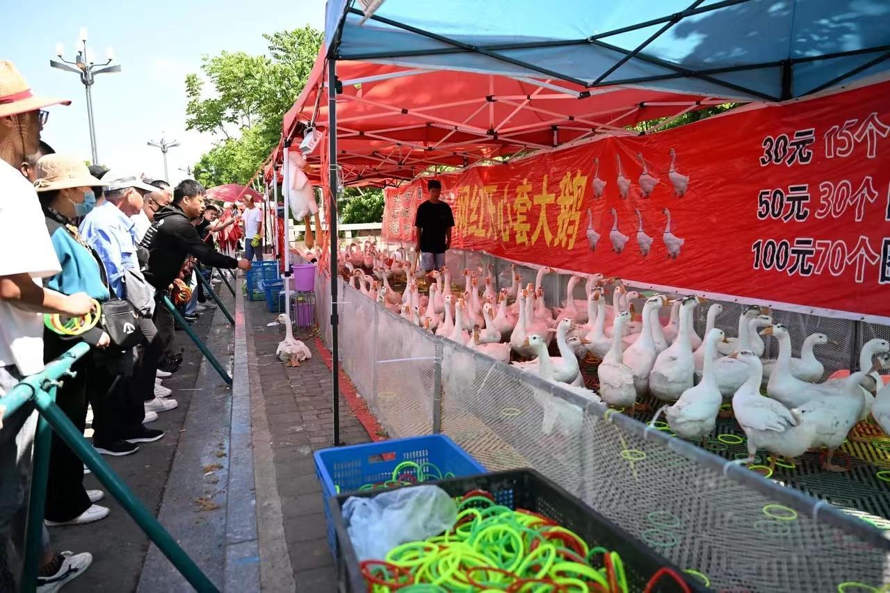 “太熱鬧了!像這樣的露天廟會活動着實難得了。很多外地人都跑來海州逛白虎山廟會。”位於娛樂體驗區的一個套鵝攤位前圍滿了消費者,大家爭先恐後掃碼付款,攤位負責人王先生臉上笑開了花。
