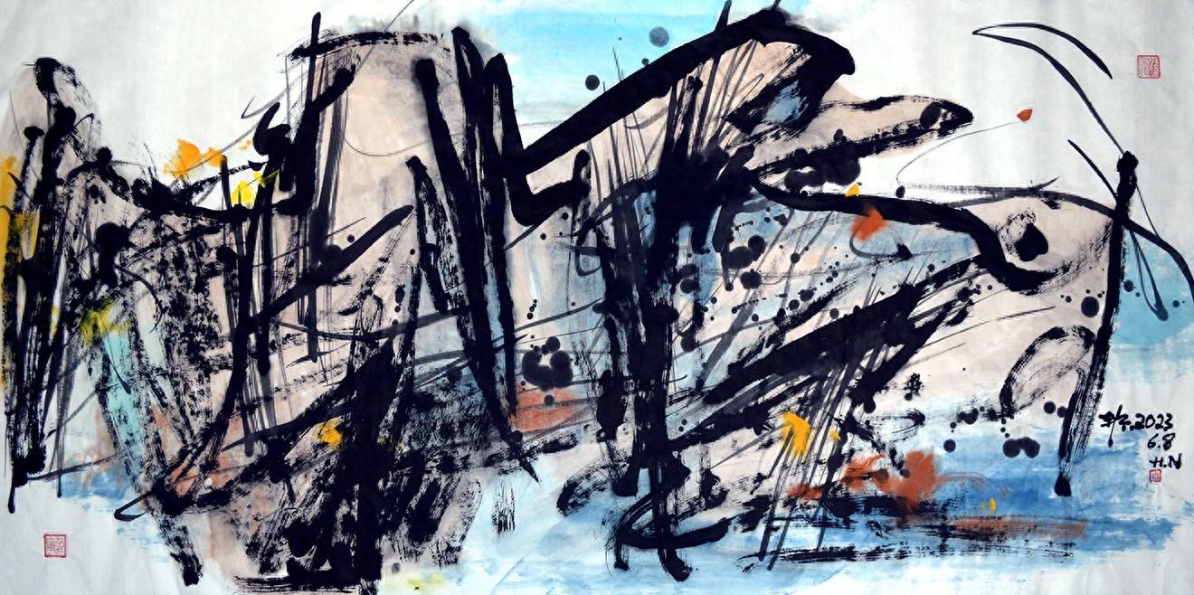 這是個抽象繪畫語言,更與情緒化表現關聯,算是一種抒發、釋放的自我形象描述吧。就是想把筆墨與視覺符號色彩結合起來,去表現一種筆與墨的力度與黑白對比度,尤其是墨色在筆道的應用下與宣紙的各種關係變化,之表現與衆不同之處,有水泊梁山好漢之歌的味道,鏗鏘有力江湖氣、匪氣與霸氣。