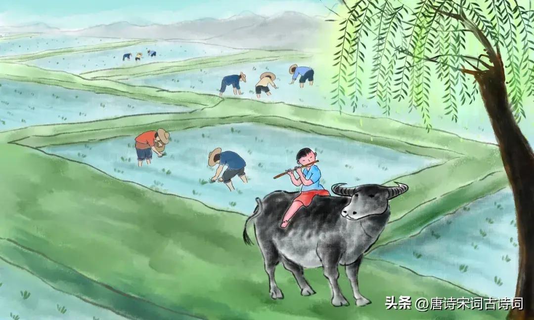 “臥牛吹短笛,耕卻傍溪田。”這兩句是說,放牧時,趴在牛背上,吹着短笛;牛在耕田時,他就倚在溪田邊悠閒玩耍。這是寫“牧童之悠閒”。