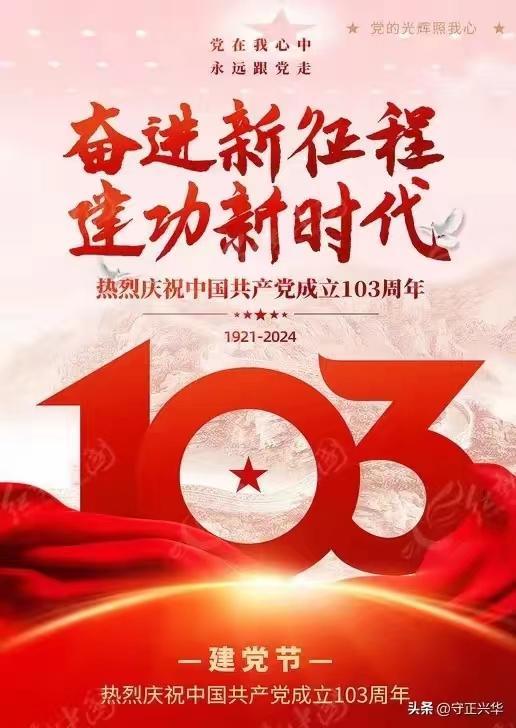 一把普通的鐮刀和鐵錘,有了深刻的命題:收割了華夏黎明的希冀;鍛打了中華民族自強不息的脊樑,鑄造了共和國的燦爛輝煌。一面血染的黨旗,撕破了昨天的黑暗,啓盼來希望的晨曦,迎來了黎明的曙光,創造了輝煌的明天。偉大的黨,你是一部豐厚的中國史書長卷,記載了中國共產黨103週年光輝的戰鬥歷程,銘刻着永恆的豐碑。你代表着一個國家、一個民族所擁有具備的一種百折不撓的毅力、堅韌不拔的精神、強大的力量,不可戰勝的偉岸身軀。你支撐着整個中華民族的巍峨大廈。你是黨的象徵,在前進路上導航;你是一輪朝陽,光芒萬丈、旭日東昇!你追求真理給人民帶來希望;你的偉大信仰目標,激勵着九千萬黨的英雄兒女們萬衆一心,披荊斬棘,奔騰向前!