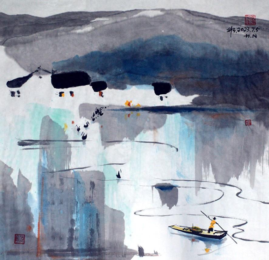 小船悠悠盪盪,鴨鵝成羣而至如魚得水般撒歡,山水之間白牆黛瓦的建築透着一種接山接水合而爲一的感覺。山的博大精深與水的寬廣無限,人的勤勞智慧表現出一種和諧之美,天人合一的藝術表現力與哲學思想的完美體現。