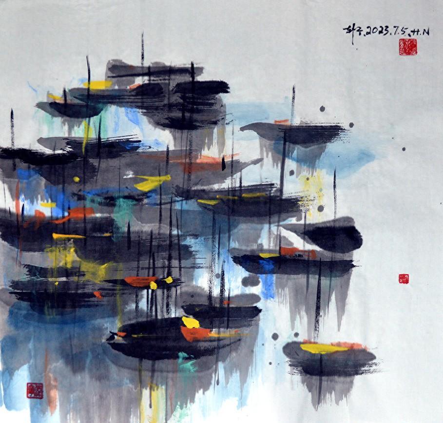 有意識無意識的點綴,構成的大小組合與黑白灰關係對比產生的視覺感,形成了形式美感的架構。美的元素得到了光明亮麗的體現出來,嫣然是一道風景,是一幅畫的藝術,來自於心裏透徹與磊落的表達,幾分純粹、幾分沉浮上下而透明,彷彿是水面、是天空都有了必要的交代而完全表達並且呈現出來滿滿的畫面。這就是筆未到意已到的東方意境的表達吧,而非像西畫那樣“如實”交代畫的滿滿的。