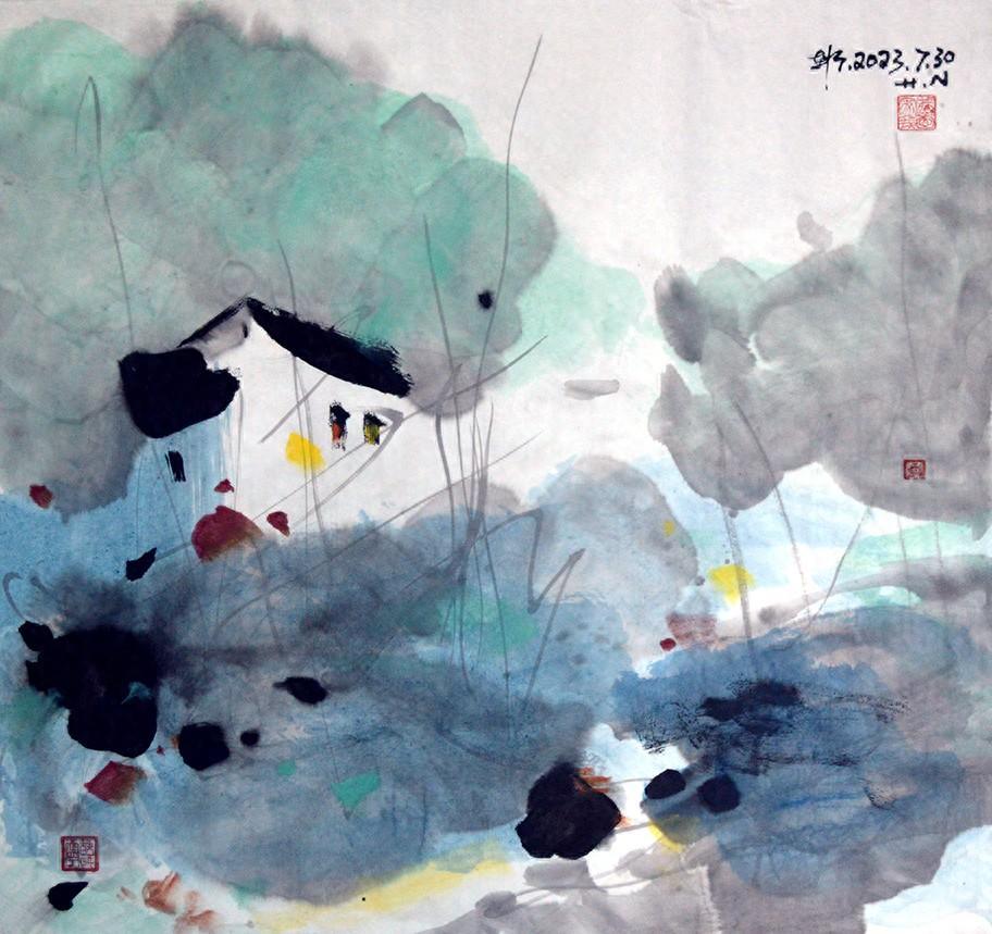 簡明扼要,平淡無奇而雅緻的格調,凸顯出細膩含蓄的韻味十足與飽滿的情懷。美在簡約裏展現,美在然而中出現,美在不明不白的時刻顯現。展現出它的魅力,出現在自然又常態化之中,又在輕描淡寫的筆下呈現出婉約而綿長的情調。雖然是意猶未盡,雖然是情懷與筆墨的融洽,有了主次關係的襯托,有了點線面構成的形式美感,更有了飄逸的水墨韻律,畫入心而有感懷,畫入感而成詩意,畫入醉意朦朧而獨醒。
