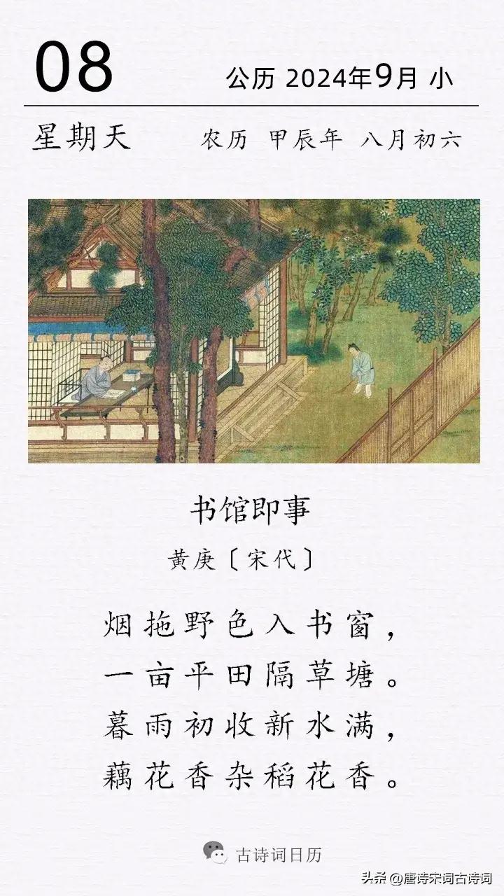 “暮雨初收新水滿,藕花香雜稻花香。”三四句是說,傍晚剛下過一場雨,水塘中漲滿了雨水。藕花的香氣和稻花的香氣夾雜在一起,瀰漫在空氣中。這是寫“書館之環境”。