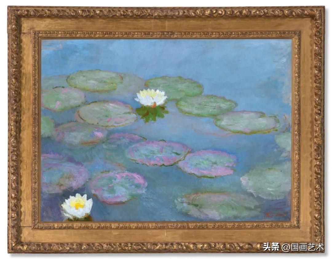 首組《睡蓮》系列的畫作在格式、尺寸、顏色和處理手法上不盡相同。此次上拍的《睡蓮》色調最爲統一和細膩,藍色、紫羅蘭和綠色交融瀰漫,兩朵生動的白蓮花格外醒目,相映成趣。莫奈的筆觸似乎也沒有他在1870年代創作印象派先驅畫作時那麼鬆散和隨性。