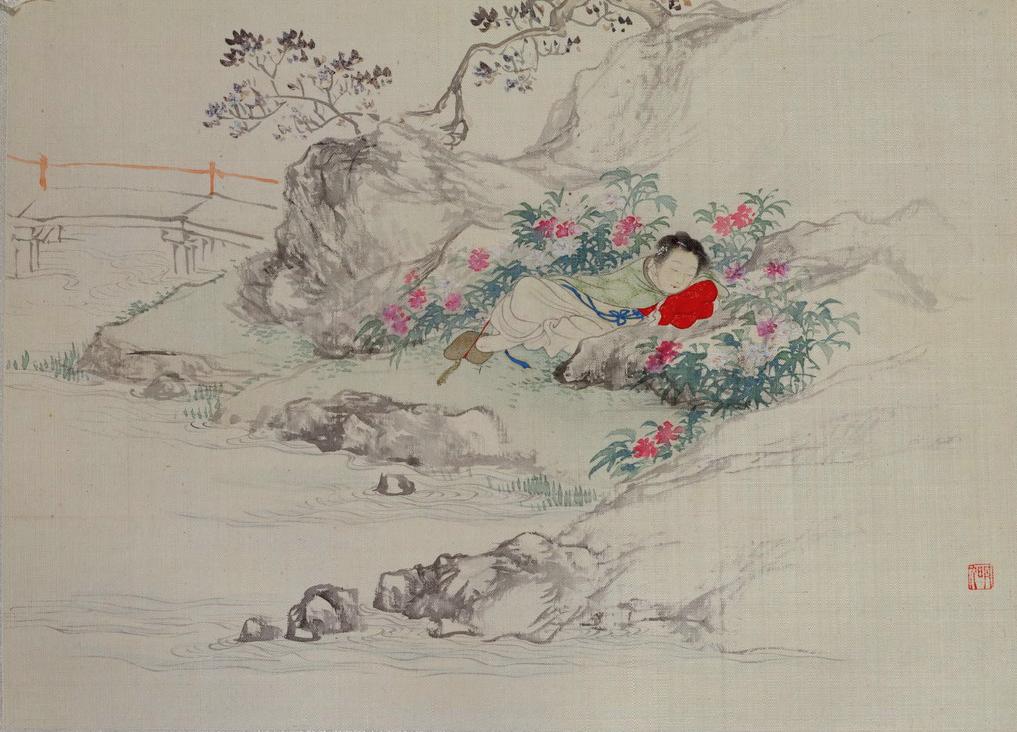 “黛玉葬花”《紅樓夢》中的經典片段。黛玉憐花惜花,花亦是人的隱喻,花落以後隨流水“流到髒的臭的地方豈不可惜”?於是黛玉將其收殮於絹袋埋在土裏。