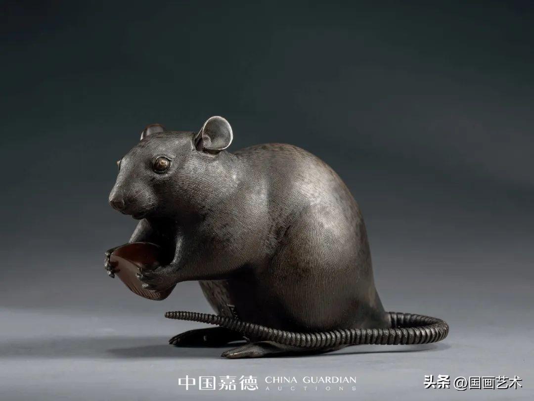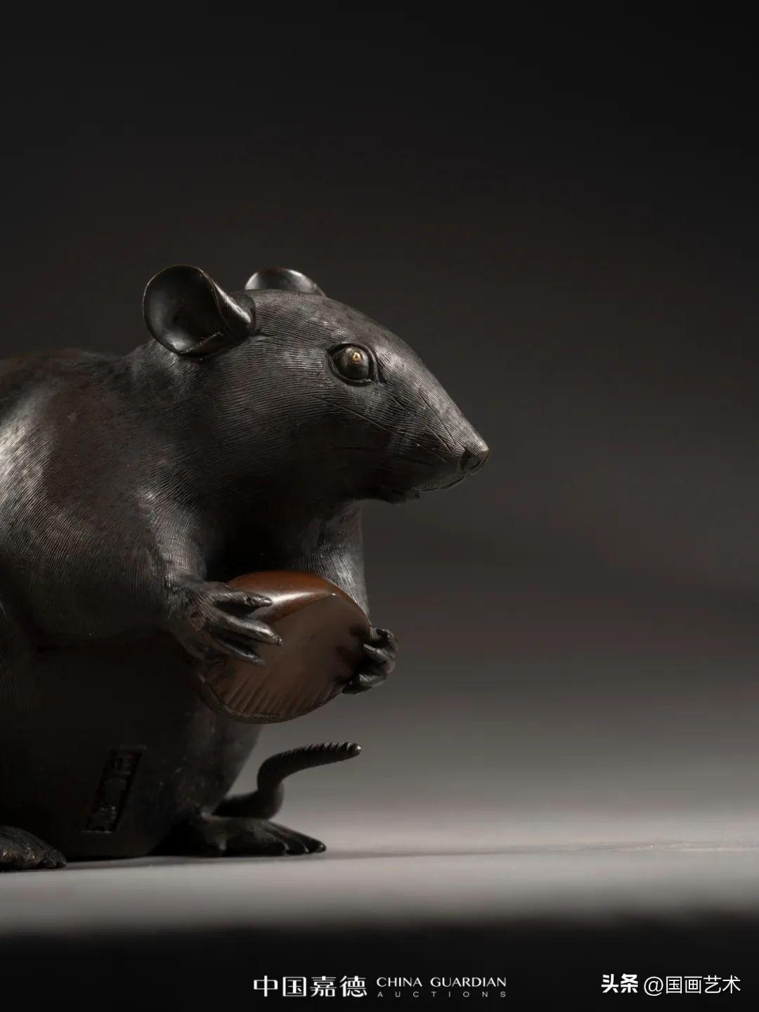 此擺件寫實生動,鑄工精湛,刻畫入微,造型惟妙惟肖,活靈活現,極具動感,保存狀態完好。鼠在傳統文化中佔據重要地位。在最早的詩歌總集《詩經》中,就有詩篇以鼠喻人。十二生肖中,鼠排名第一位。宋人洪巽的《陽穀漫錄》認爲,地支中“子、寅、辰、午、申、戊俱陽,故取相屬之奇數以爲名,鼠、虎、龍、猴、狗皆五指,而馬,單蹄也;醜、卯、巳、未、酉、亥俱陰,故取相屬之偶數爲名,牛、羊、雞、豬皆四爪,兔兩爪,蛇兩舌也。”老鼠前足四趾,後足五趾,奇偶兼具,而子時爲陰,鼠子時最爲活躍,故居首位。傳說中老鼠咬開混沌,而牛則開闢大地,故有“鼠咬天開”之說。全國各地許多民族多有鼠上天偷得谷種傳播人間,帶來了農耕文明的故事,因此鼠也被奉爲“五穀神”。老鼠旺盛的生命力和驚人的繁殖力更是令人類望塵莫及,因此它們被賦予繁衍不息、子孫興旺的吉祥寓意。在民間藝術年畫、剪紙、木刻版畫、刺繡、織錦、皮影、甚至是墓室壁畫中,都能窺見老鼠古靈精怪的身影。