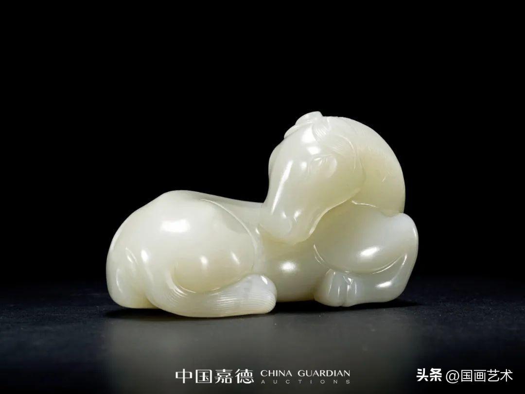 玉馬玉質青白,圓雕而成,作臥伏狀,四肢盤曲,菱形眼,口脣緊閉,下顎線條優美,神情溫順,脖頸低垂,向下凝視,馬鬃覆於頸背,馬尾修長貼服於側,馬蹄刻劃清晰。刻工簡潔得當,鬃毛略加雕琢,絲縷分明,馬身寥寥數刀,而矯健之姿宛然如生。