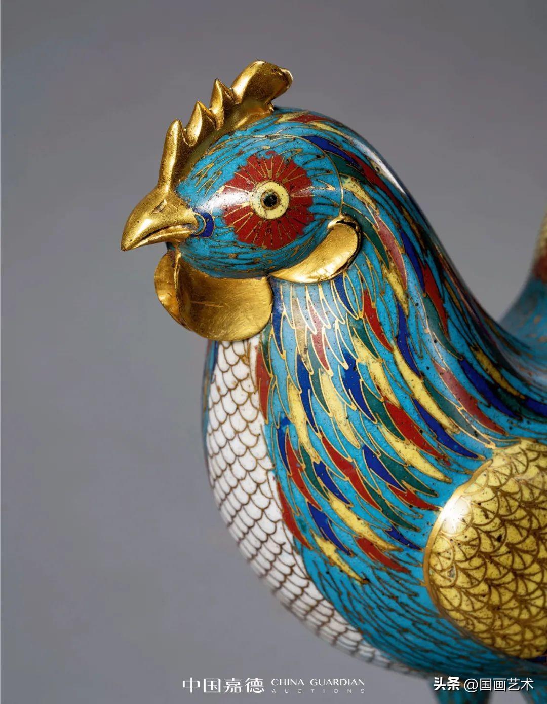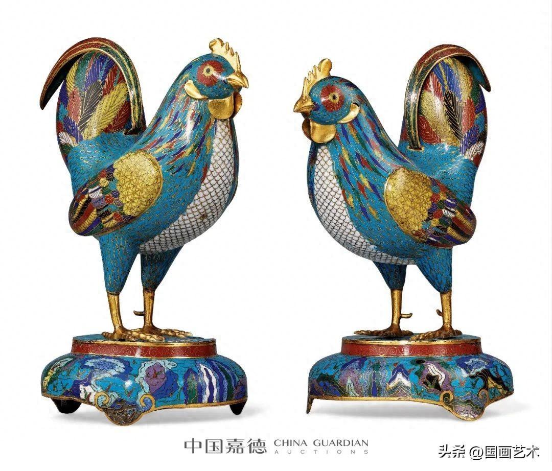 此對銅胎掐絲琺琅公雞,採取仿生技法。公雞昂首挺立,以紅、黃、藍、綠、黑、白色琺琅表現公雞的冠、眼、羽毛,刻畫極爲細膩。其喙、冠、腿、爪皆施鎏金,流光溢彩。並配有掐絲琺琅底座。此對銅胎掐絲琺琅公雞製作繁縟與精細相結合,做工嚴謹但不失活潑生趣。器形優美,栩栩如生,可稱琺琅器中之珍品,宮廷氣息濃郁,或爲清中期內務府造辦處所製作的宮廷陳設品。