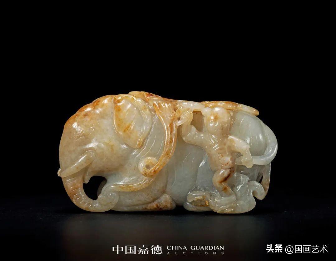 玉象取和田帶皮白玉,質地油潤,雕琢一隻跪姿大象,長鼻下卷,一股水花噴薄而出,直奔象背。旁立一童子,頭扎髮髻,手持如意,手舞足蹈狀沖洗象背,雕工細膩精湛。