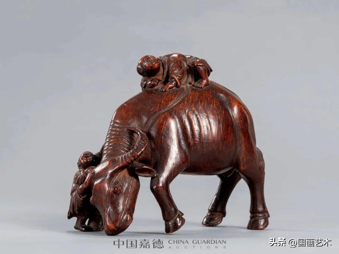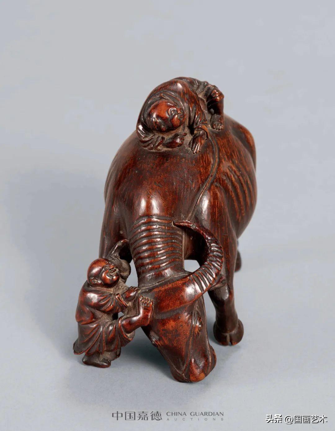 此擺件取竹材雕制而成,一童子趴臥於牛背之上,揚頭上望,牧牛鼻牽繮繩,腹圓腿粗,牛尾隨擺其後,做俯首狀,另一童子立於牛首一側,好似想順牛首攀爬而上,更突顯兩童子的天真爛漫與悠然自得。
