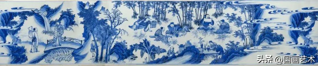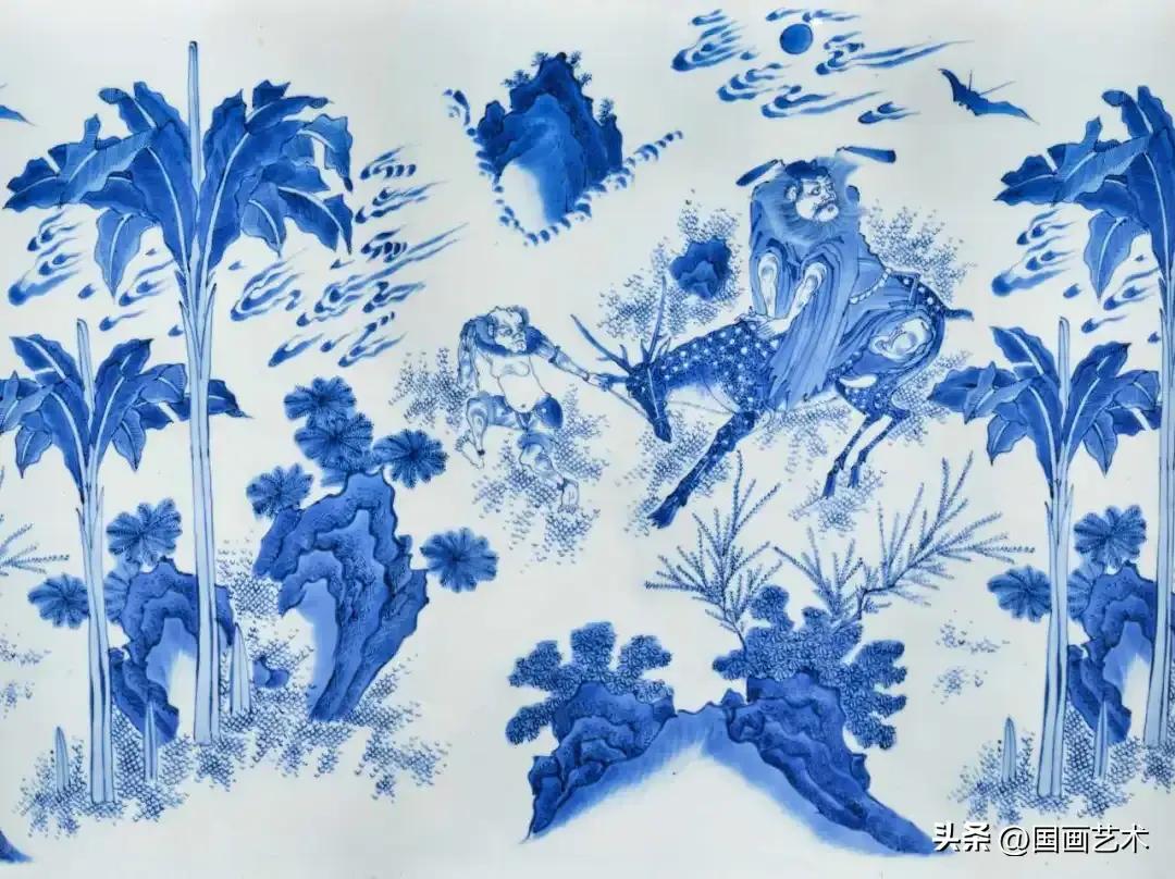 此器胎質厚重,尺寸碩大,實爲難得。藏家墨一閒亦甚爲感嘆,於其筆記笑言此乃筆筒之“父”。此筆筒帶有明清過渡期青花器物的典型特徵,具體可見於描繪樹木、岩石和水流的筆觸,例如魚卵狀的草葉畫法讓人聯想到當時畫譜如《芥子園畫傳》中可循的技法。