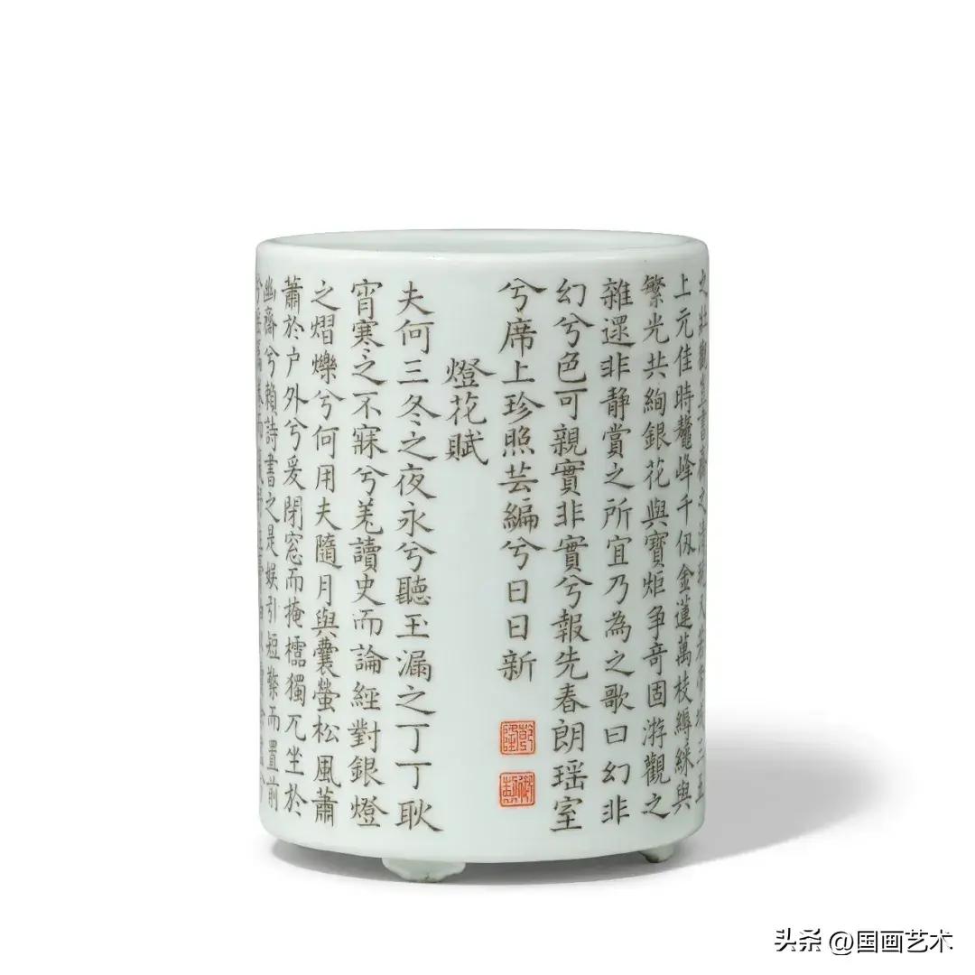 此筆筒精美小巧,做工精細,書法佈局整齊,筆鋒有力,落款“乾隆”“御製”,故此筆筒或爲皇帝所定製。詩題《燈花賦》,乃乾隆帝仍爲親王時所作,輯錄於《樂善堂全集》卷十一。此詩描述一個嚴寒晚上,詩人(或親王自己)提燈夜讀,燈影搖曳,映照出花朵的模樣。乾隆帝於1736年下令出版此詩文集,由此推斷,此詩應是1736年前的作品。至乾隆十七年(1752),皇帝下令此集上的詩作不再書於御製瓷器上,因此本品應在1752年前製成。