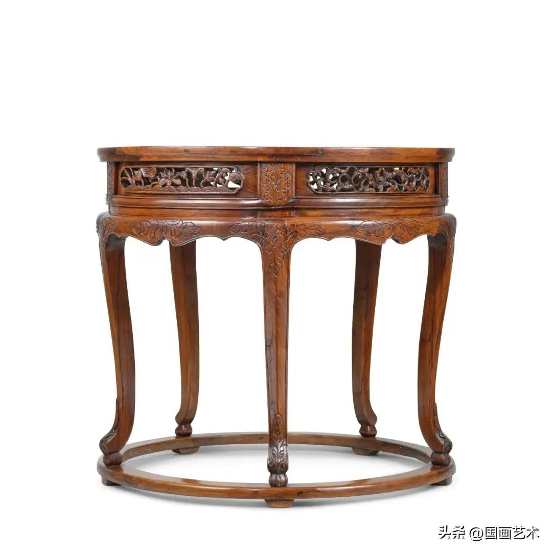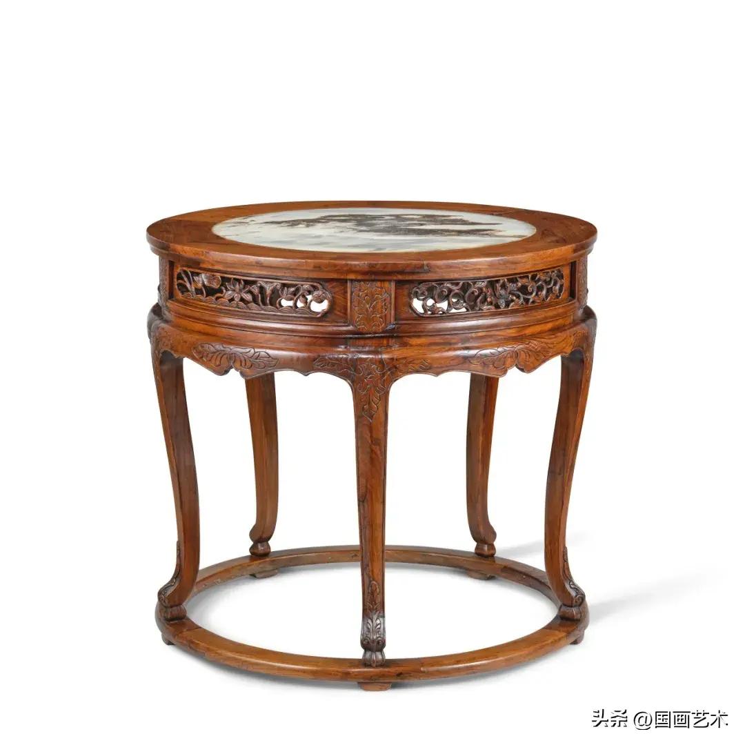 本拍品爲傳世明式傢俱中最爲罕見與稀少的例子。桌面裝有大理石面心,紋理清晰生動,彷彿大自然的鬼斧神工,將山川河流的壯麗濃縮於一方桌面之上。高束腰間五片彎弧透雕花卉卷葉紋絛環板,鑲入起線刻草花紋的腿足上部,腿足下展爲線條優美的外翻卷葉紋足,整體造型優美,設計不僅體現了明式傢俱的簡約美學,更體現了其結構設計上的獨到之處,展現了明代工匠的高超技藝。