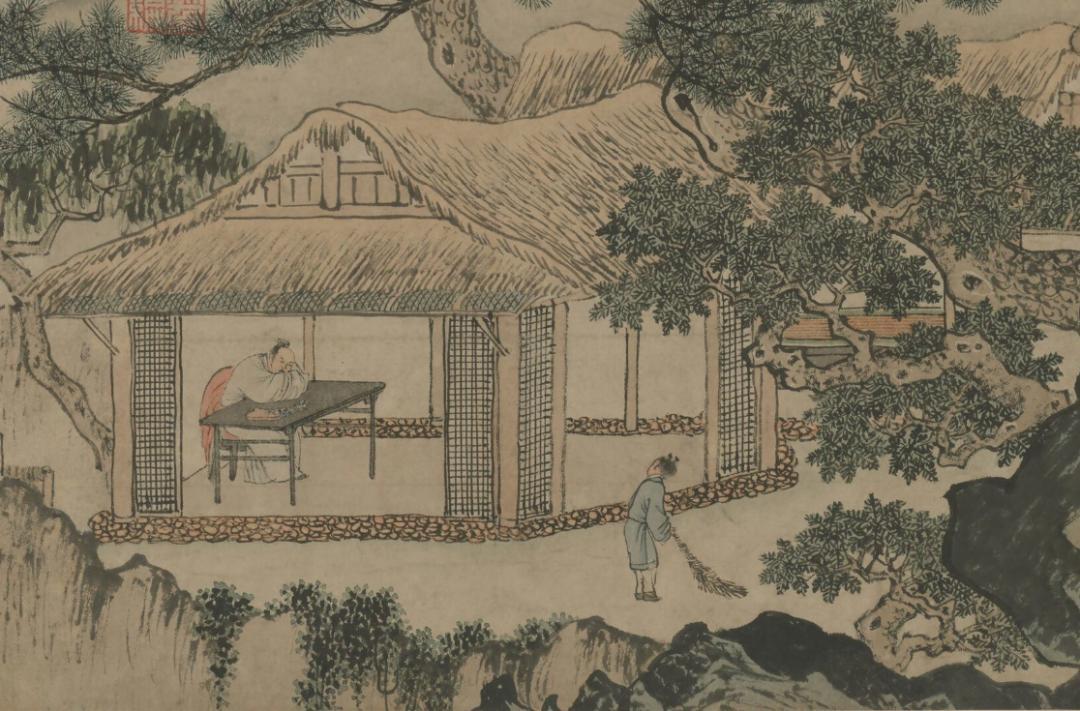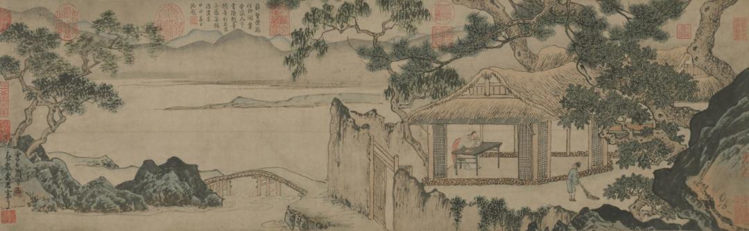畫面起首以裴君的草堂爲中心展開,這是一間軒敞明亮、陳設簡潔的草堂,屋外古松盤曲,環境優美。主人正伏在案上休憩,堂外有一童子持帚清掃,體現出閒雅出塵之趣。隨着畫面延展,板橋連岸,春水潺湲,遠處青山逶迤,平湖無涯。好一派悠遠閒適的風景。