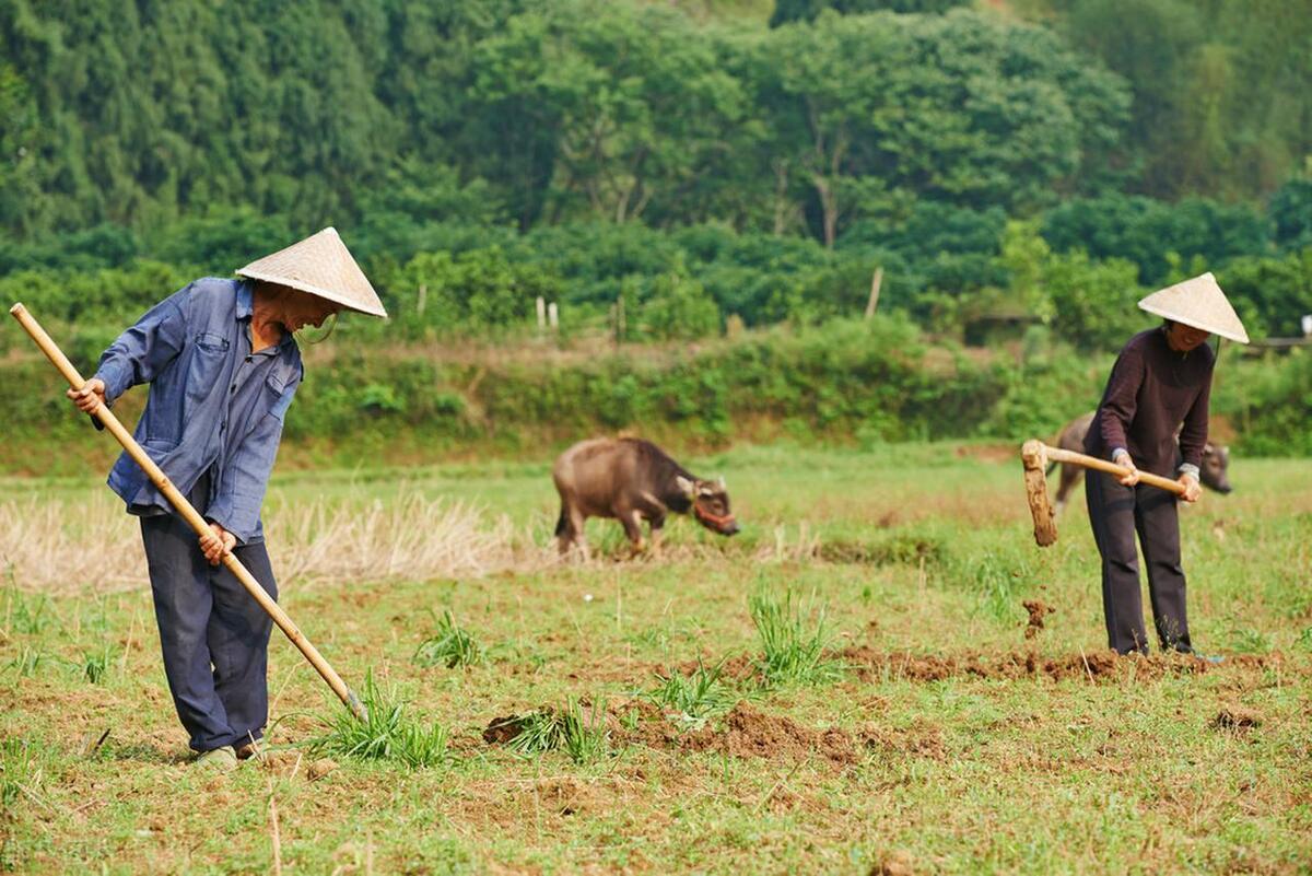 -播種五穀的,風調雨順。手磨多層繭,汗水灑農田,稻菽千重浪,地鋪萬斛糧,稻穀堆滿倉……