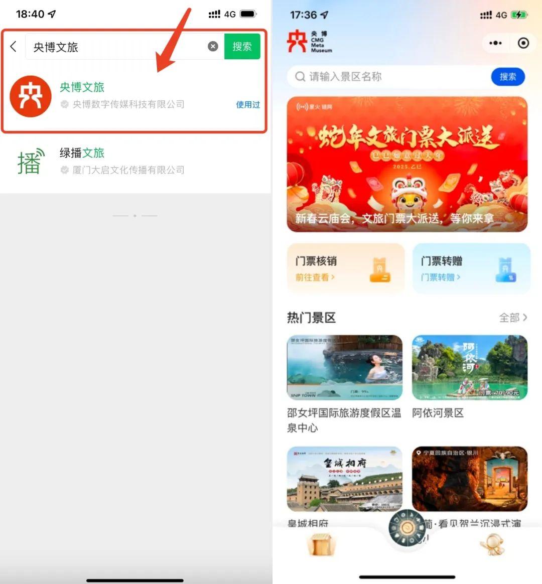 限時搶票·全民狂歡:蛇年全年(大年初一至臘月二十九),每日12:00-13:00開啓“金蛇紅包雨”,用戶登錄“央博”APP或微信小程序即可參與。門票涵蓋4A級以上景區80%,包括山西、陝西、河南、重慶等18個省,含龍門石窟、武夷山、黑神話小西天等熱門景點。景區具體名單見央博文旅小程序,後不定期更新。